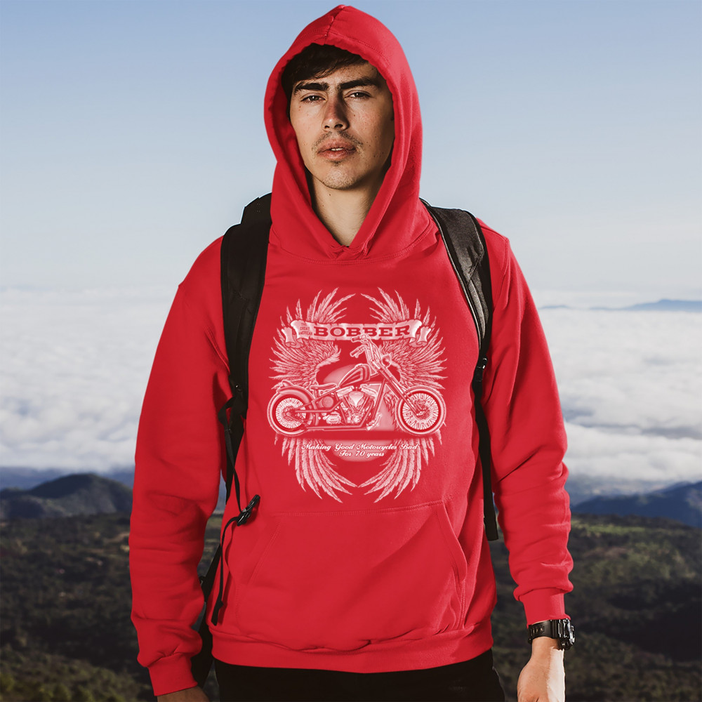 A print featuring a bobber motorcycle and a pair of wings in the background. At the top there is a stripe with "The great American bobber" written on it. At the bottom the print says: "making good motorcycles bad for 70 years". A great choice for a motorc