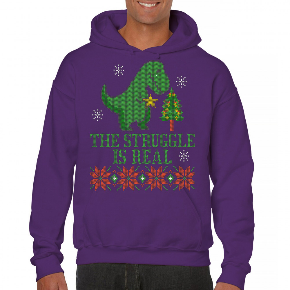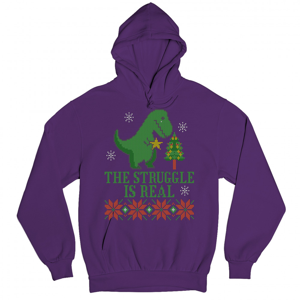A funny print saying: "The Struggle Is Real" and featuring a sad tyrannosaurus rex holding a toy star in it's short hands standing by a Christmas tree. The print is decorated as an ugly sweater. Amazing choice to make people smile and spread positive vibe