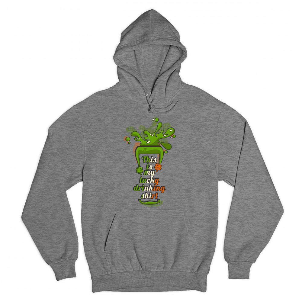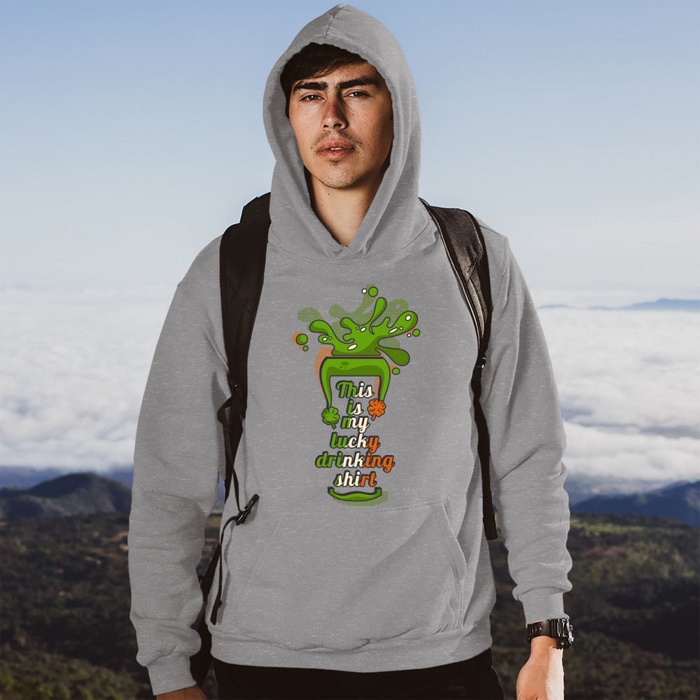 A print featuring a silhouette of a glass with beer spilling out of it. Inside the glass there is a text: "This is my lucky drinking shirt" in the colors of the flag of Ireland. A great choice to wear on March 17 to celebrate the St. Patrick's Day and sho
