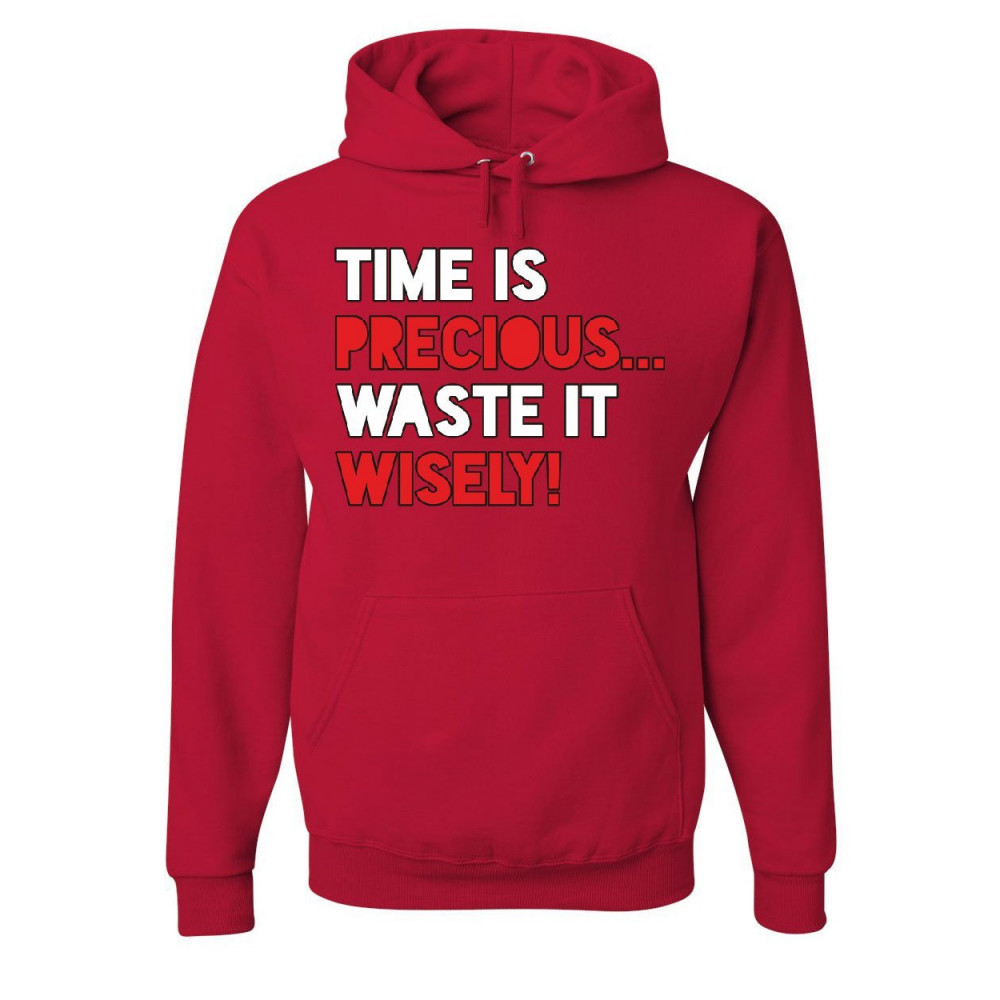 TIME IS PRECIOUS WASTE IT WISELY! time is precious waste it wisely hoodie college humor lazy fun sweatshirt red