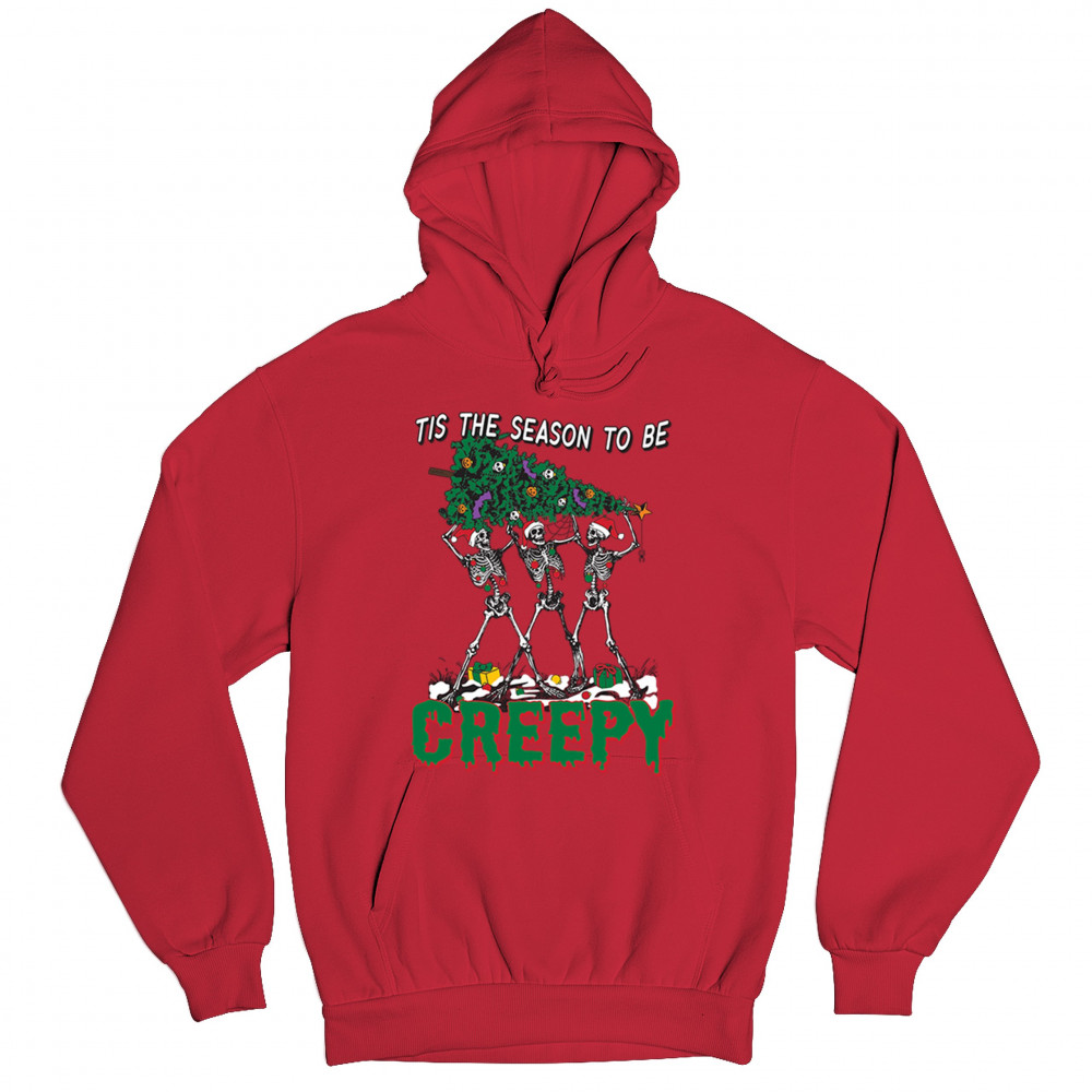 "Tis the Season to Be Creepy" combines holiday cheer with a hauntingly fun twist. This creative design features skeletons donning Santa hats as they carry a spooky Christmas tree decorated with eerie ornaments. Perfect for holiday gatherings, Secret Santa gifts, or themed parties, this design celebrates the festive and the macabre. Embrace the jolliest and creepiest bunch this season with this standout apparel.