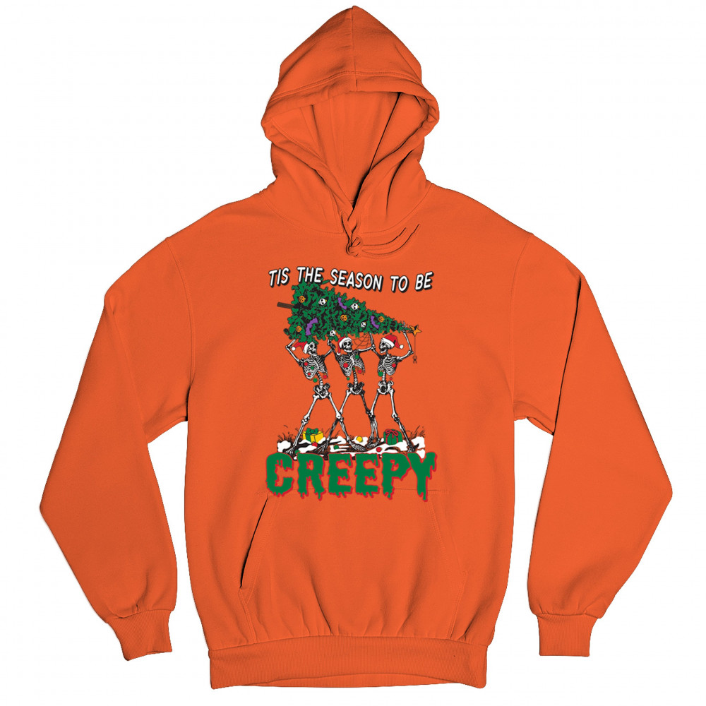 "Tis the Season to Be Creepy" combines holiday cheer with a hauntingly fun twist. This creative design features skeletons donning Santa hats as they carry a spooky Christmas tree decorated with eerie ornaments. Perfect for holiday gatherings, Secret Santa gifts, or themed parties, this design celebrates the festive and the macabre. Embrace the jolliest and creepiest bunch this season with this standout apparel.