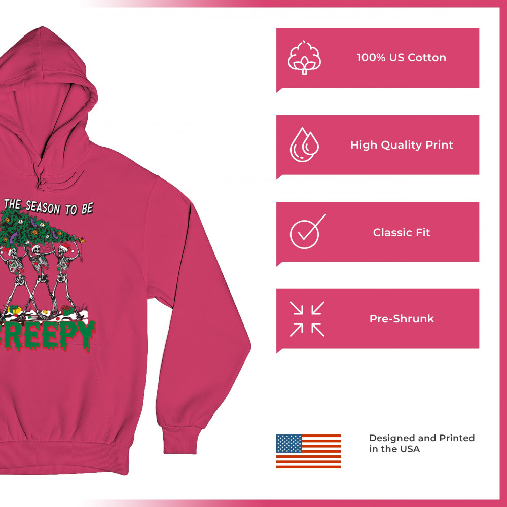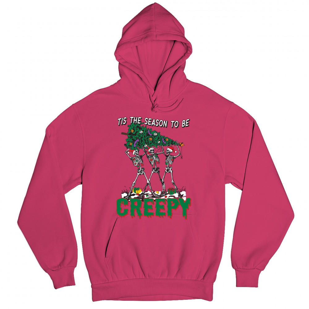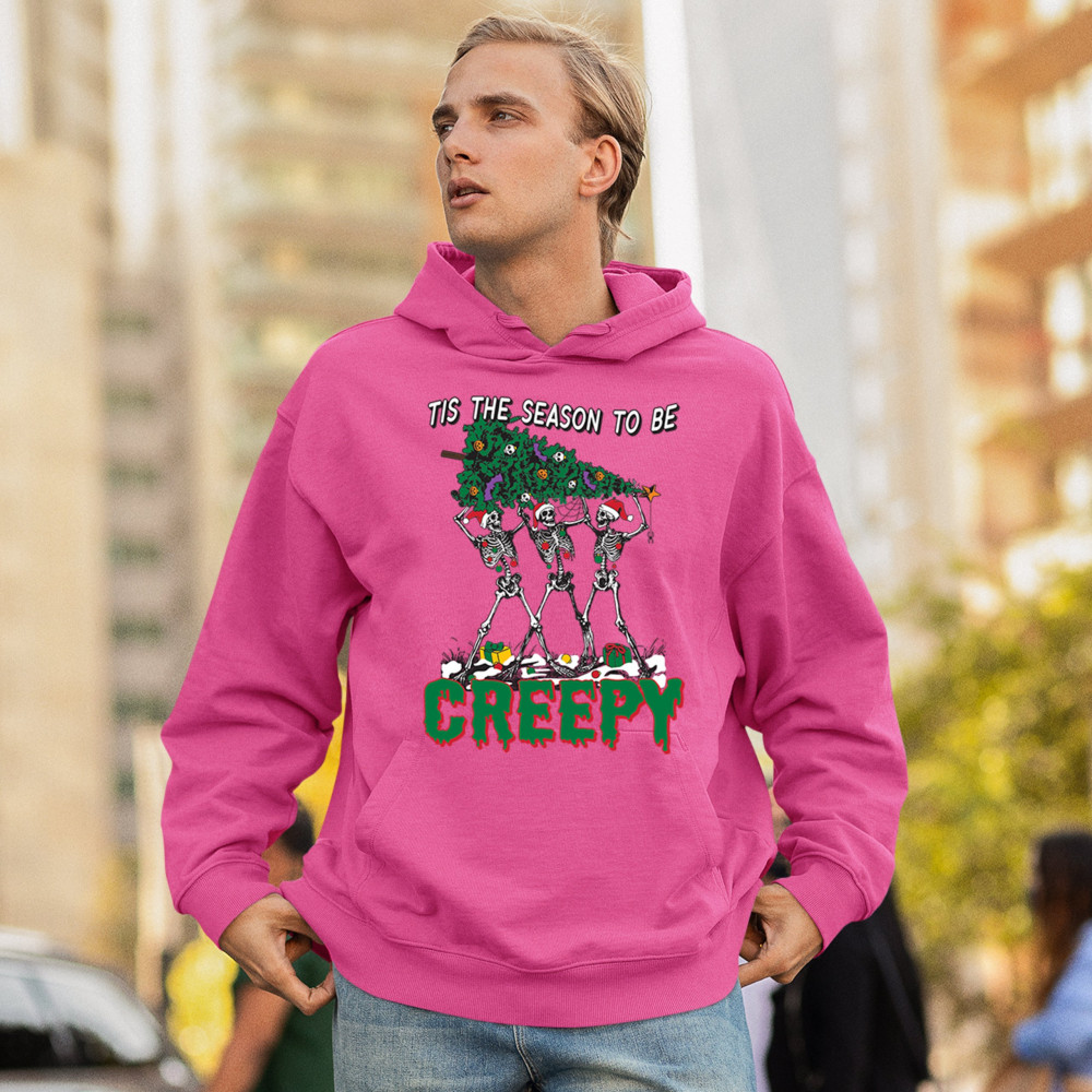 "Tis the Season to Be Creepy" combines holiday cheer with a hauntingly fun twist. This creative design features skeletons donning Santa hats as they carry a spooky Christmas tree decorated with eerie ornaments. Perfect for holiday gatherings, Secret Santa gifts, or themed parties, this design celebrates the festive and the macabre. Embrace the jolliest and creepiest bunch this season with this standout apparel.