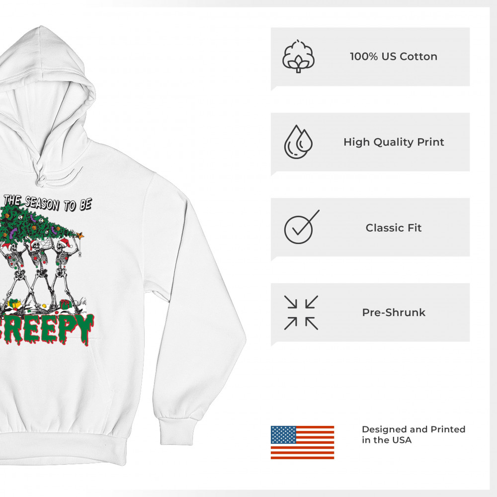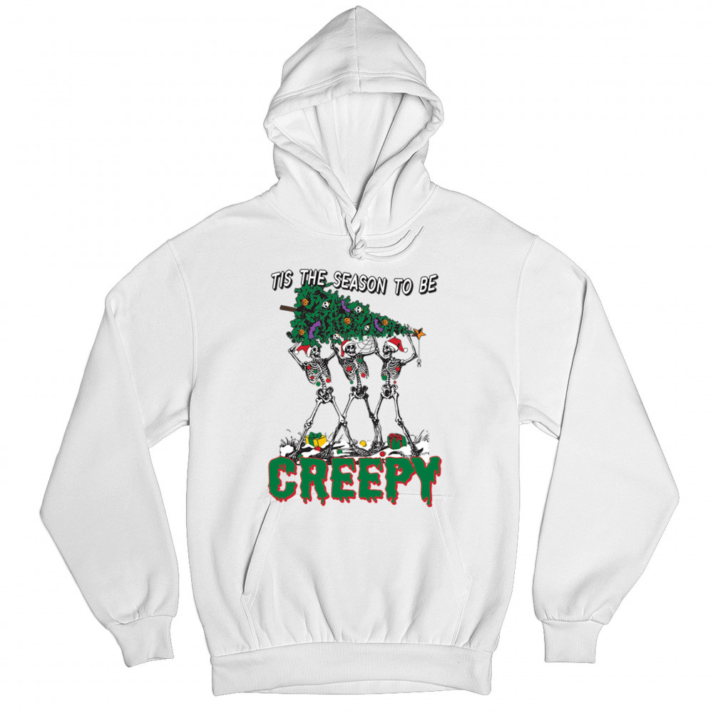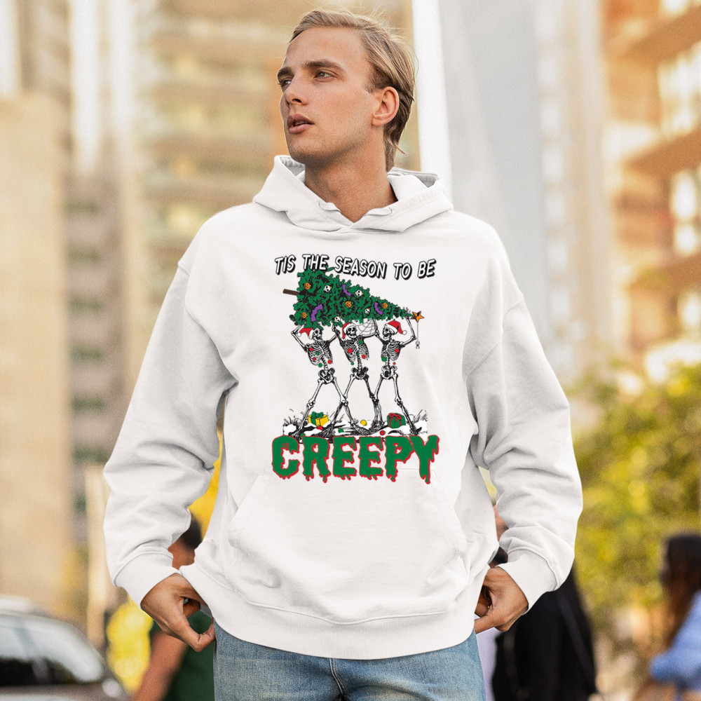 "Tis the Season to Be Creepy" combines holiday cheer with a hauntingly fun twist. This creative design features skeletons donning Santa hats as they carry a spooky Christmas tree decorated with eerie ornaments. Perfect for holiday gatherings, Secret Santa gifts, or themed parties, this design celebrates the festive and the macabre. Embrace the jolliest and creepiest bunch this season with this standout apparel.