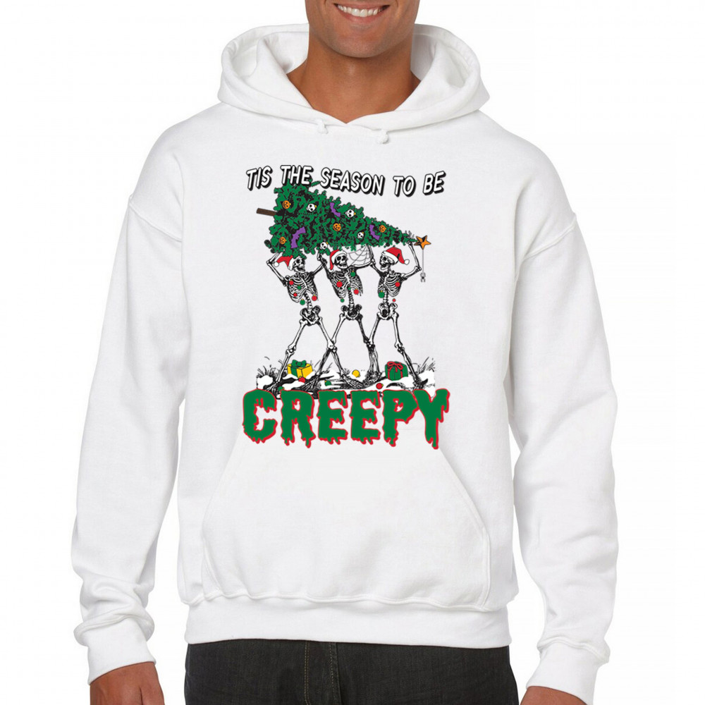 Spooky meets festive with "Tis the Season to Be Creepy" skeleton Christmas design. Perfect for holiday parties, Secret Santa, and unique gifts.