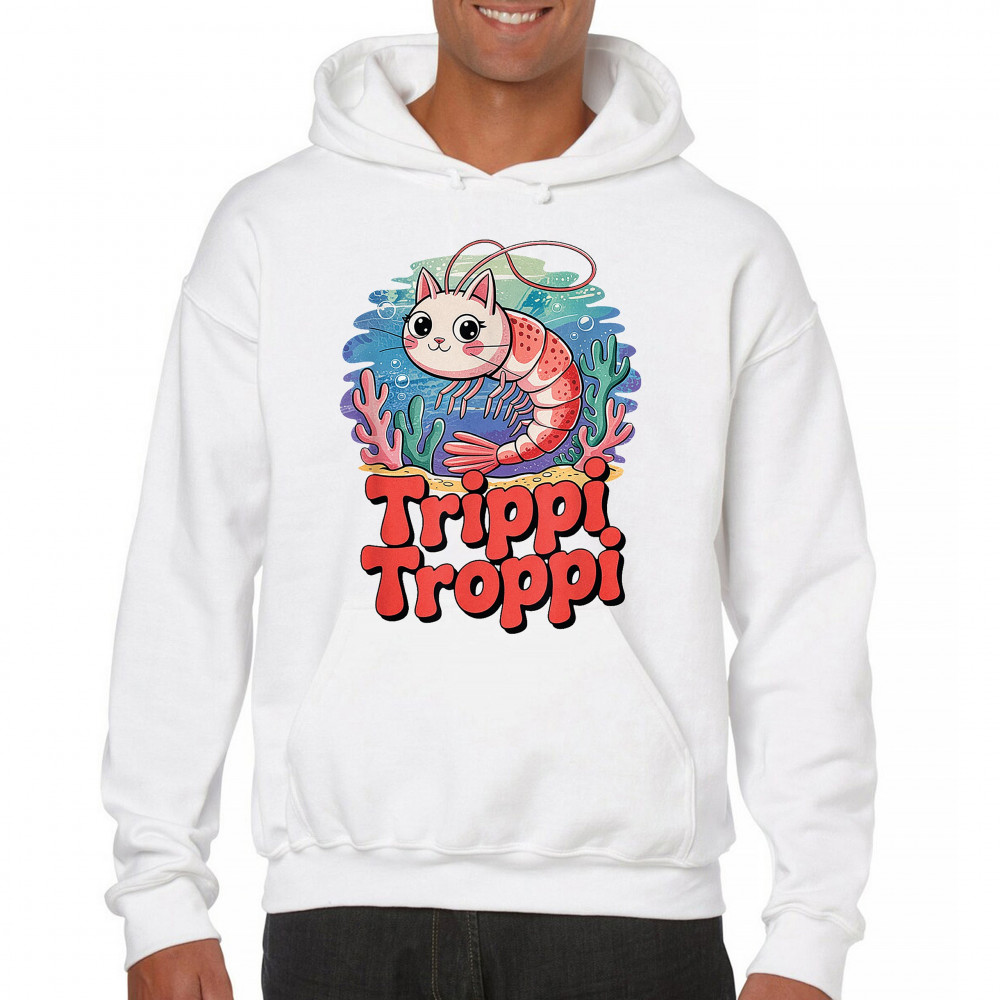 Dive deep into absurdity with Trippi Troppi—a surreal shrimp-cat fusion straight out of Italian Brainrot territory. This design captures cursed animal chaos, weirdcore visuals, TikTok meme culture, and underwater fever dream aesthetics. Made for Gen Z humor addicts, ocean meme fans, and ironic fashion lovers alike.