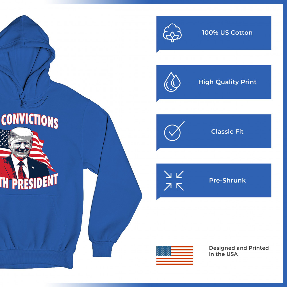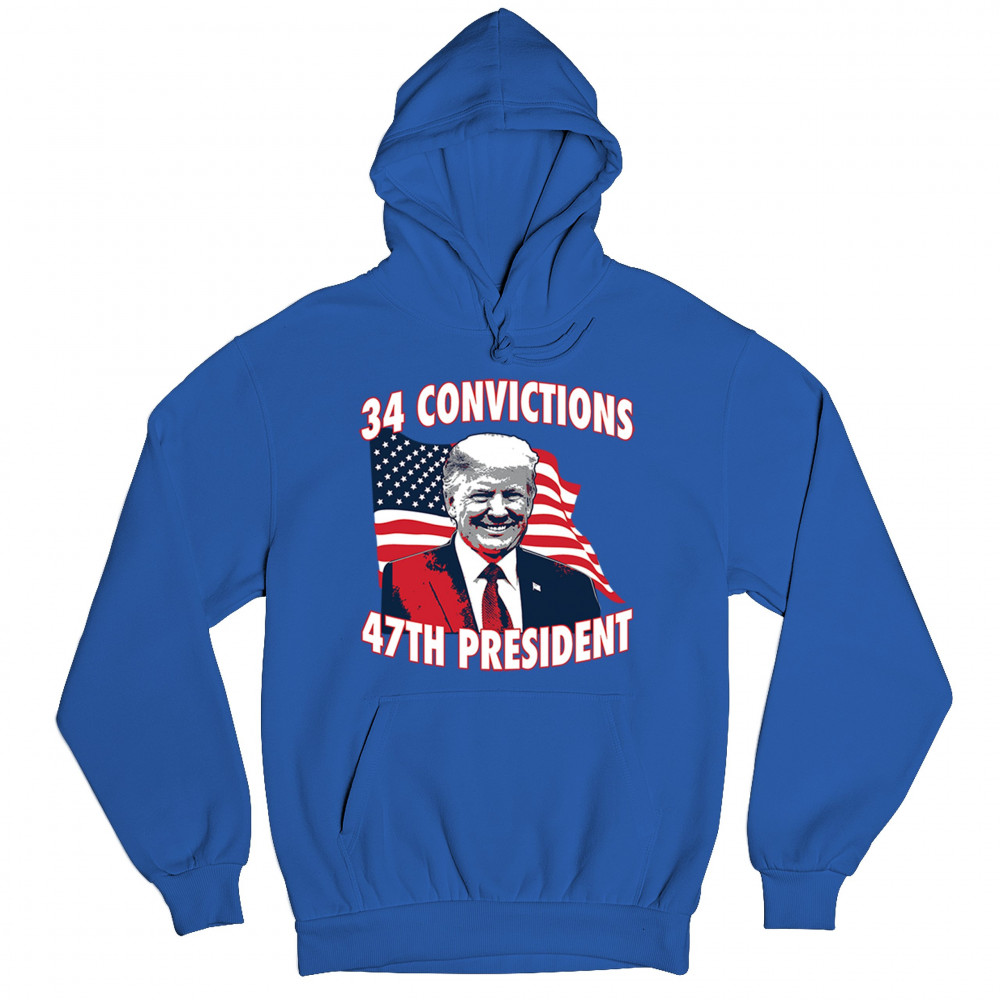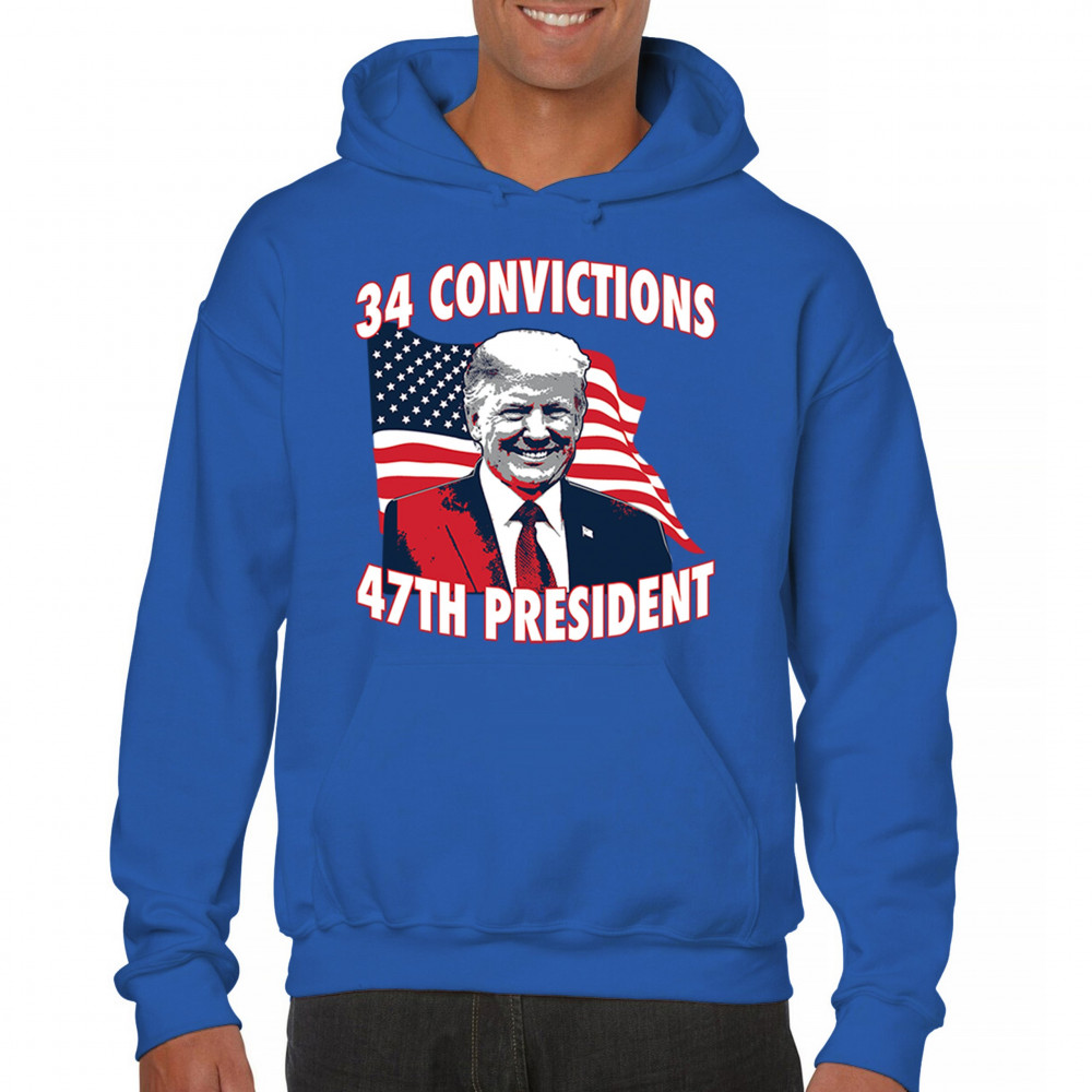Show your support for Trump's 2024 campaign with the "34 Convictions, 47th President" design. Perfect for rallies, patriotic events, and conservative gatherings.