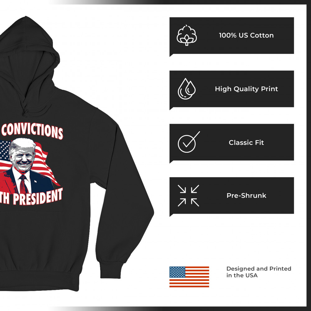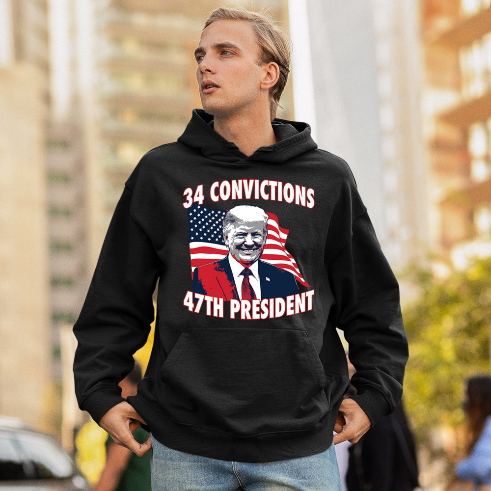Show your support for Trump's 2024 campaign with the "34 Convictions, 47th President" design. Perfect for rallies, patriotic events, and conservative gatherings.