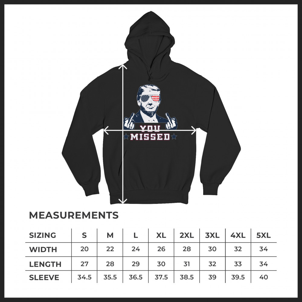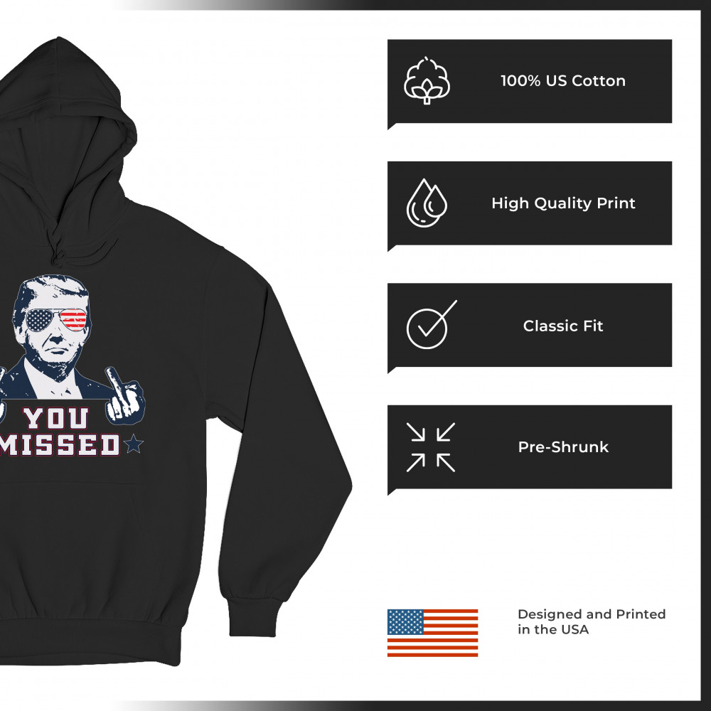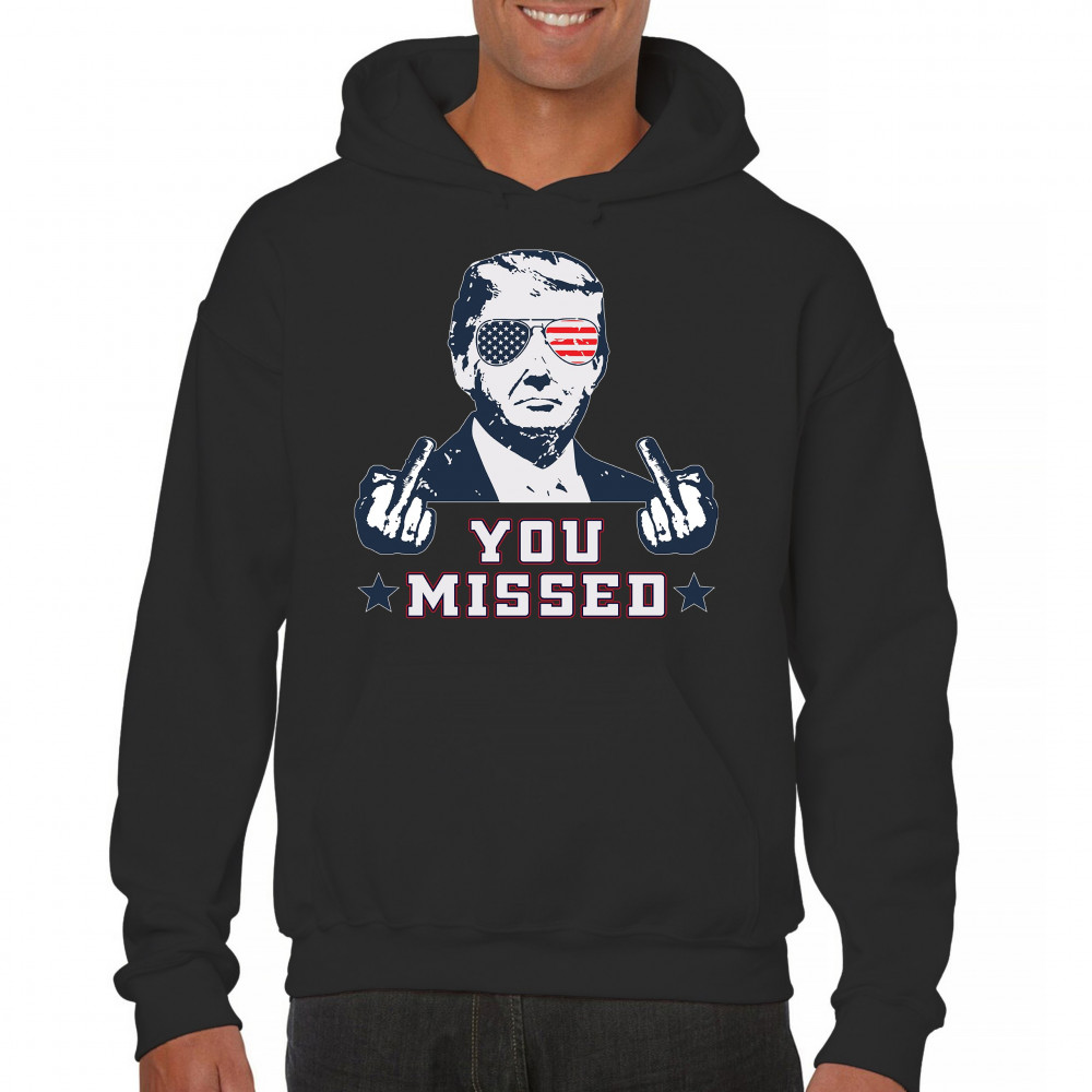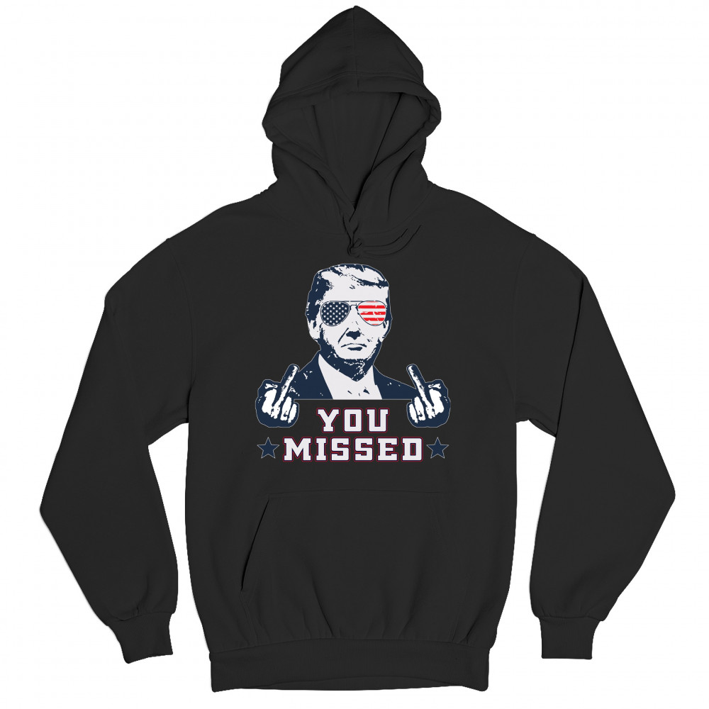 Express your patriotism and support for Donald Trump with this striking "You Missed" design, commemorating his survival of an assassination attempt during a Pennsylvania rally. The design features Trump in American flag sunglasses, defiantly flipping the bird, a bold statement of resilience. Ideal for rallies, political events, or casual wear, it symbolizes strength and unwavering support for conservative values. Show the world where you stand with this unique piece, perfect for any Trump supporter who believes in the America First agenda.