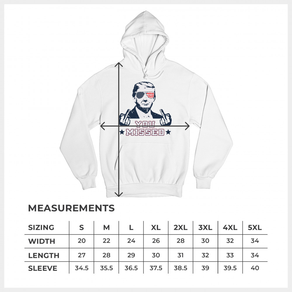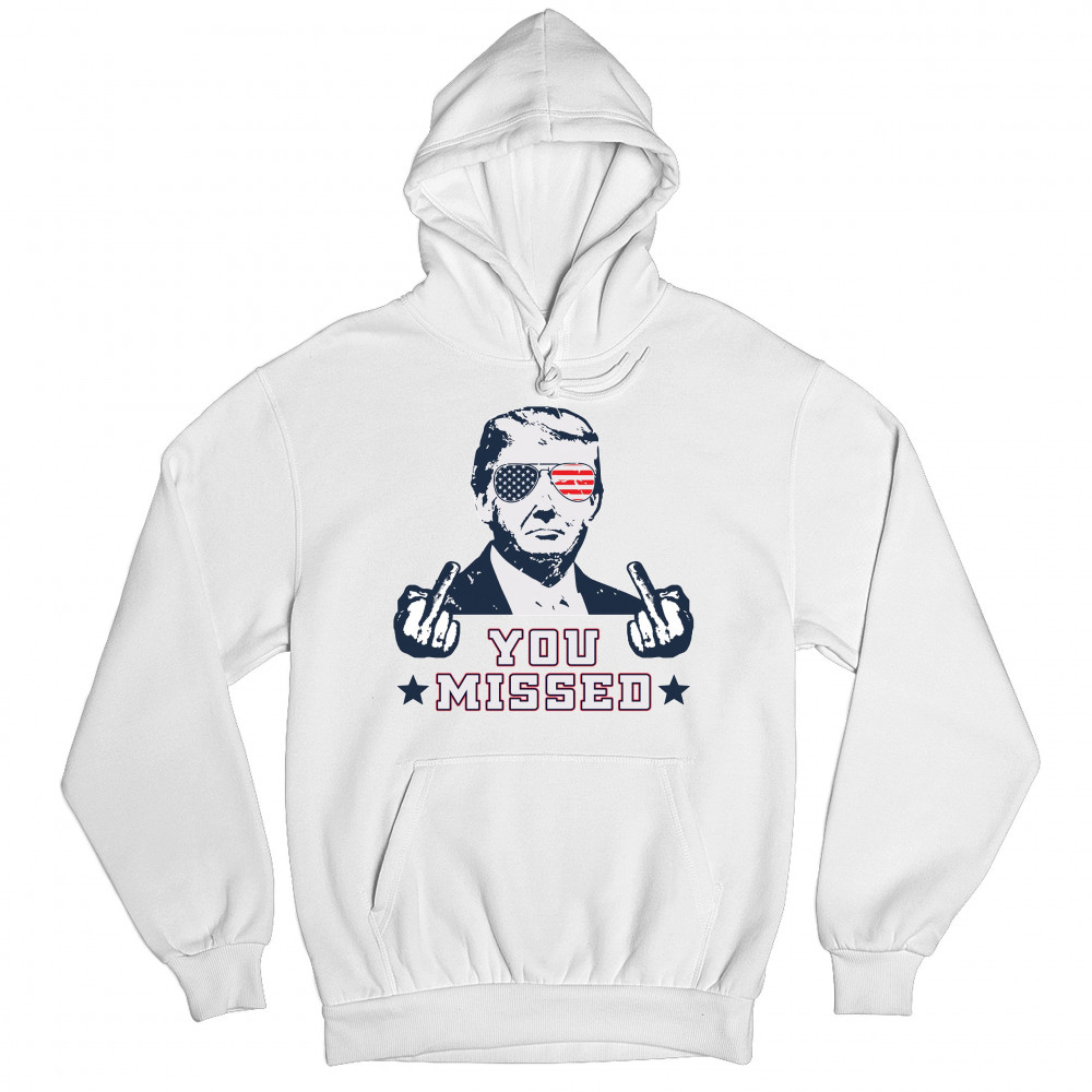 Express your patriotism and support for Donald Trump with this striking "You Missed" design, commemorating his survival of an assassination attempt during a Pennsylvania rally. The design features Trump in American flag sunglasses, defiantly flipping the bird, a bold statement of resilience. Ideal for rallies, political events, or casual wear, it symbolizes strength and unwavering support for conservative values. Show the world where you stand with this unique piece, perfect for any Trump supporter who believes in the America First agenda.