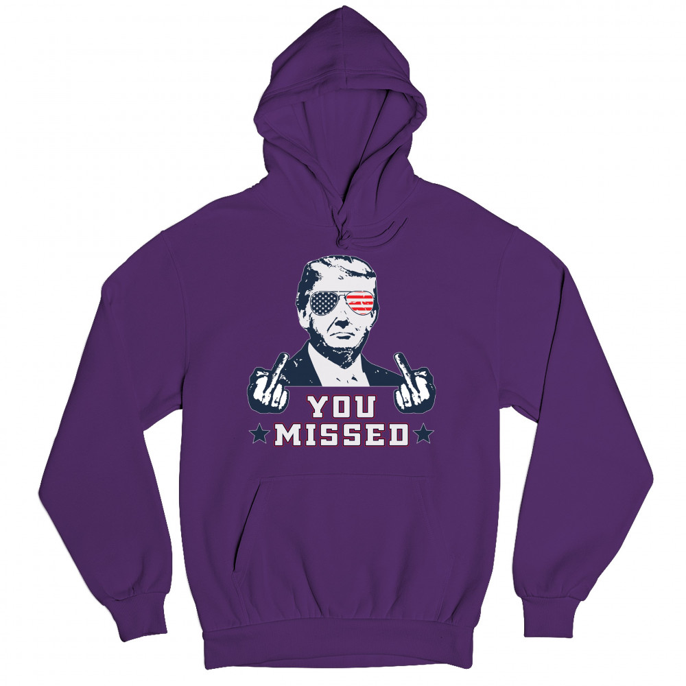 Express your patriotism and support for Donald Trump with this striking "You Missed" design, commemorating his survival of an assassination attempt during a Pennsylvania rally. The design features Trump in American flag sunglasses, defiantly flipping the bird, a bold statement of resilience. Ideal for rallies, political events, or casual wear, it symbolizes strength and unwavering support for conservative values. Show the world where you stand with this unique piece, perfect for any Trump supporter who believes in the America First agenda.