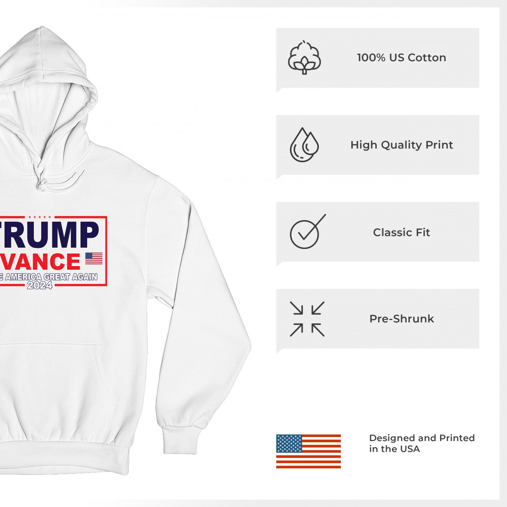 Showcase your support for the Trump-Vance 2024 campaign with this bold patriotic design featuring the American flag and "Make America Great Again" slogan.