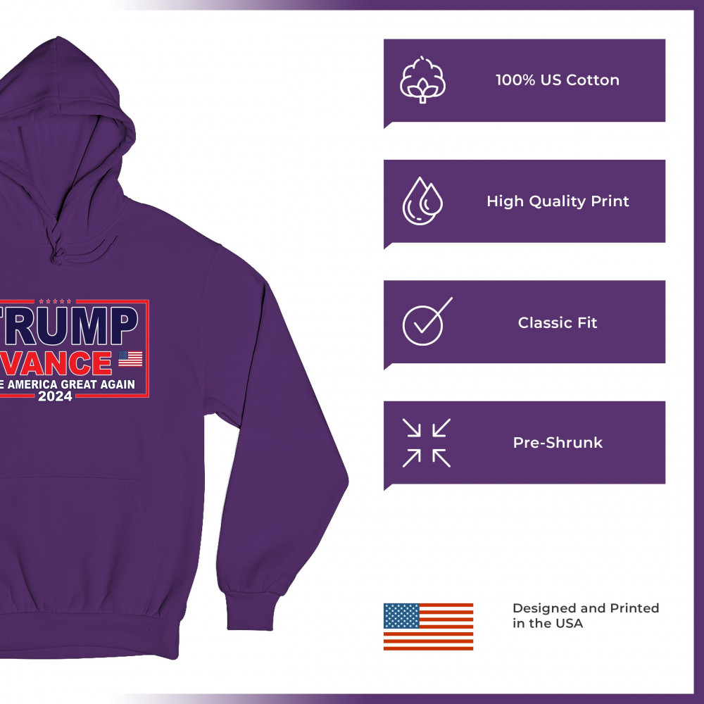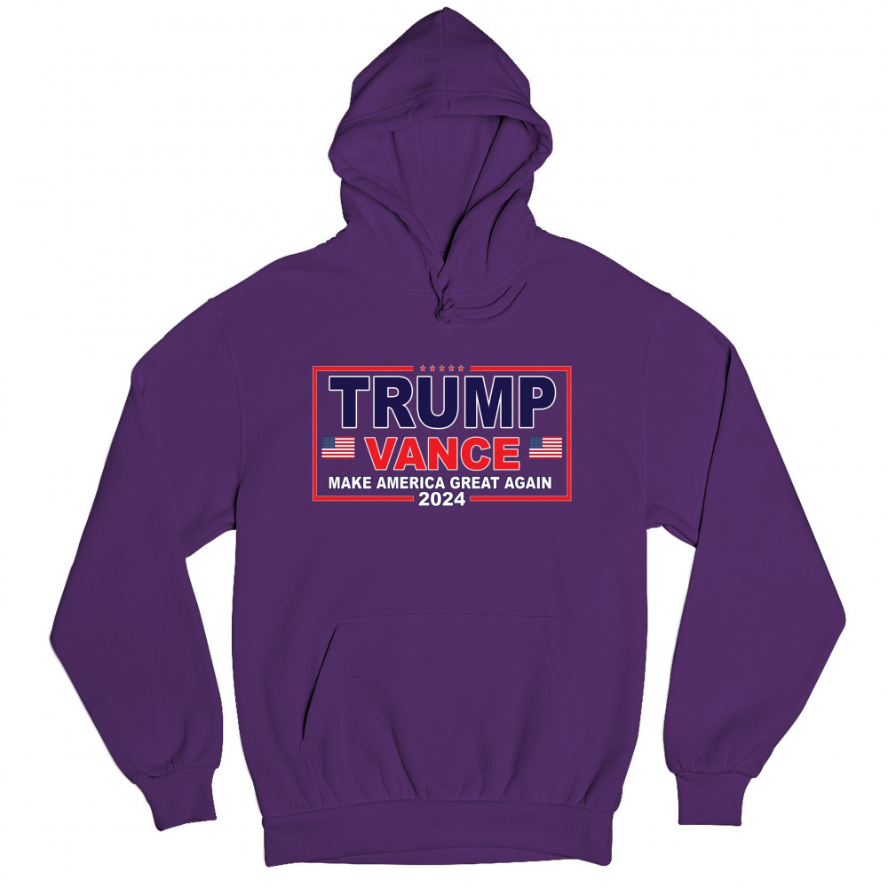 Showcase your support for the Trump-Vance 2024 campaign with this bold patriotic design featuring the American flag and "Make America Great Again" slogan.