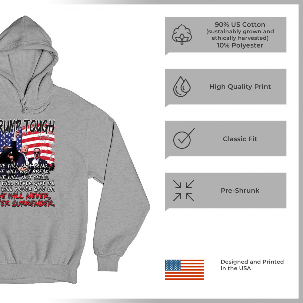 Express your support for Trump 2024 with this bold, patriotic design featuring the American flag and a powerful message. Never surrender your values.