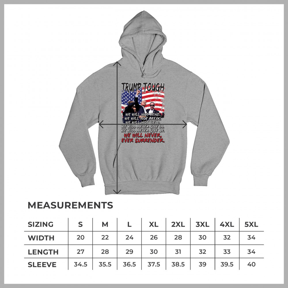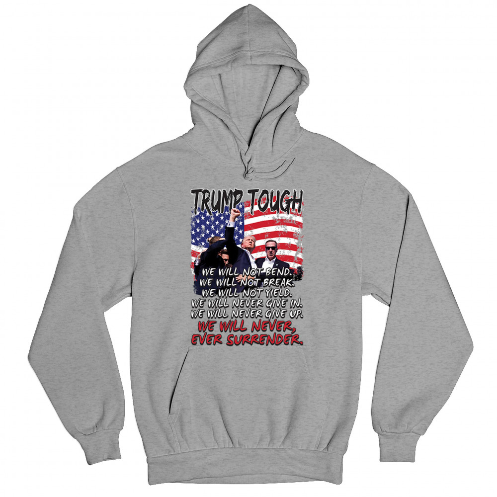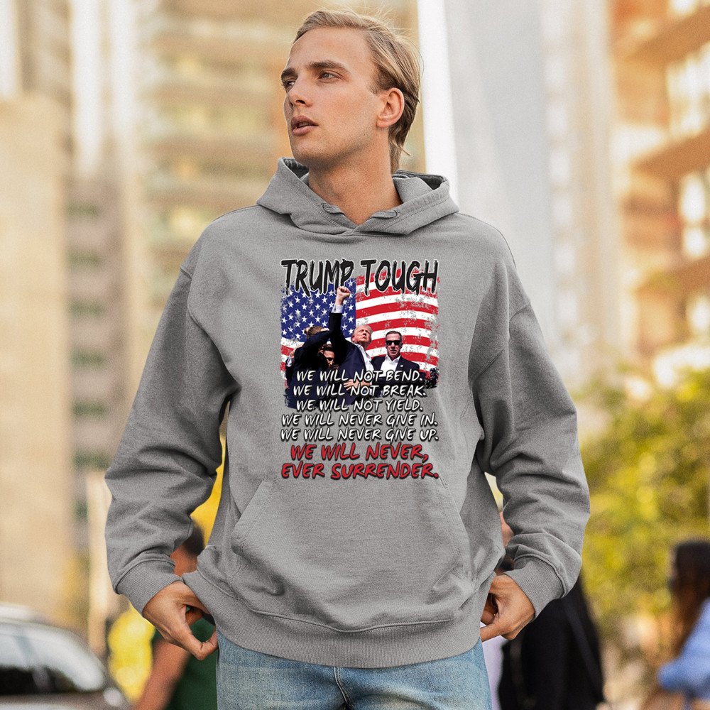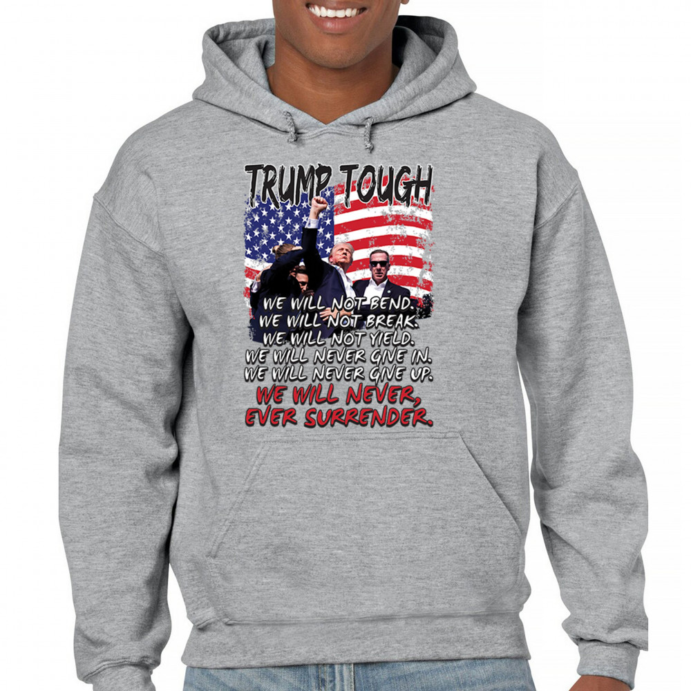 Display your unwavering support for Donald Trump with this powerful design. Crafted for those who believe in conservative values and the America First agenda, it’s perfect for any rally or event. With a striking image and the American flag in the background, this design embodies the spirit of those who refuse to give up or surrender. Show your dedication and pride every time you wear this. Join the movement and stand firm in your beliefs.