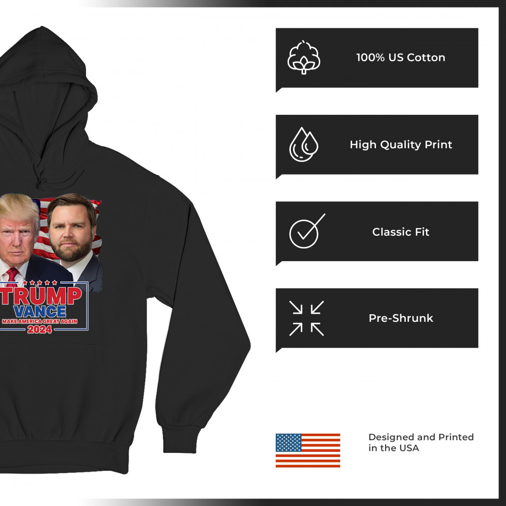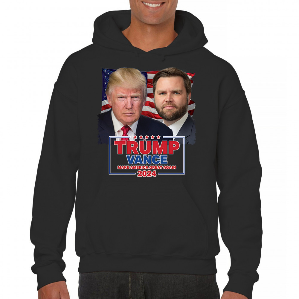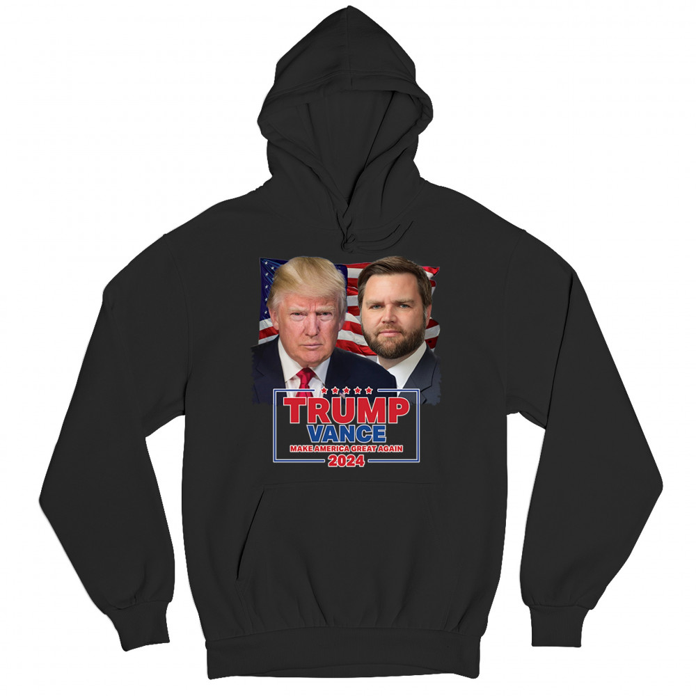 Show your support for Trump-Vance 2024 with this bold design featuring Trump and Vance against the American flag. Perfect for rallies and political events.