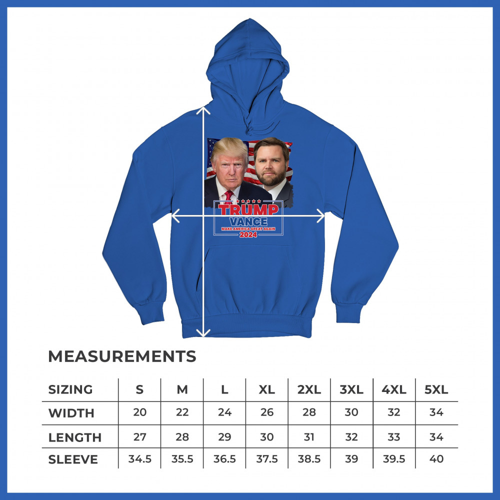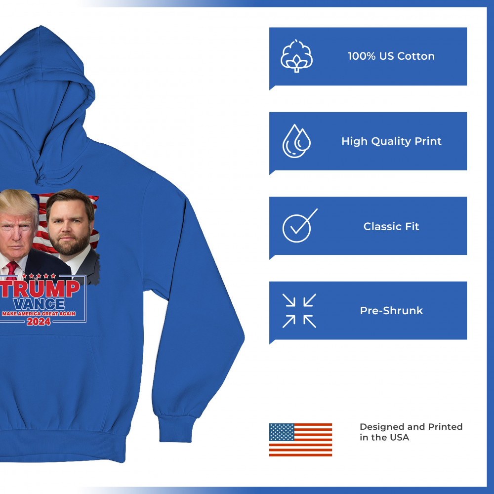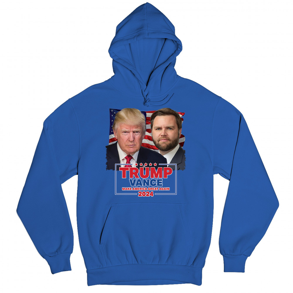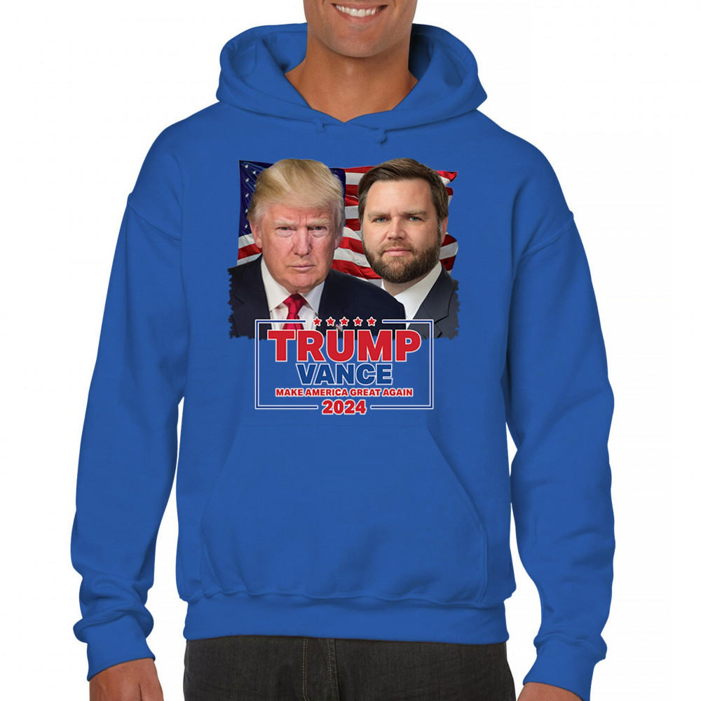 Show your support for Trump-Vance 2024 with this bold design featuring Trump and Vance against the American flag. Perfect for rallies and political events.