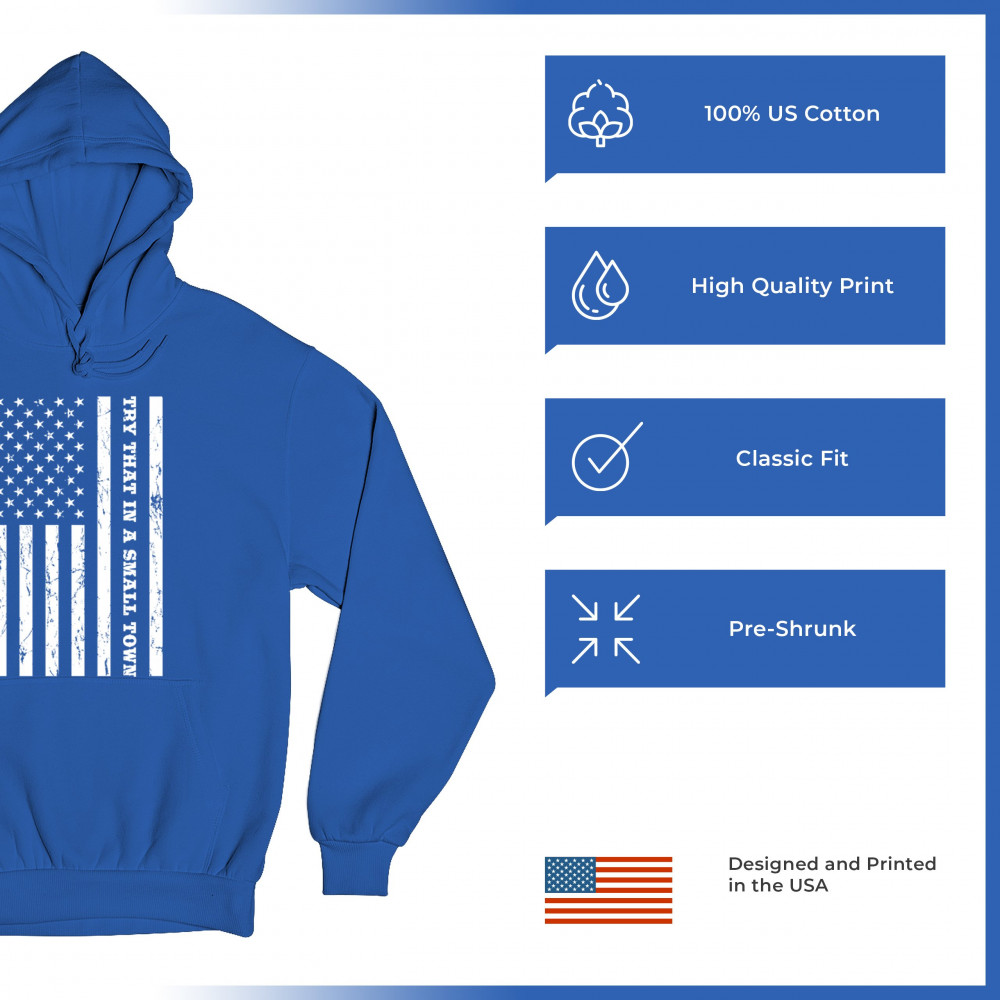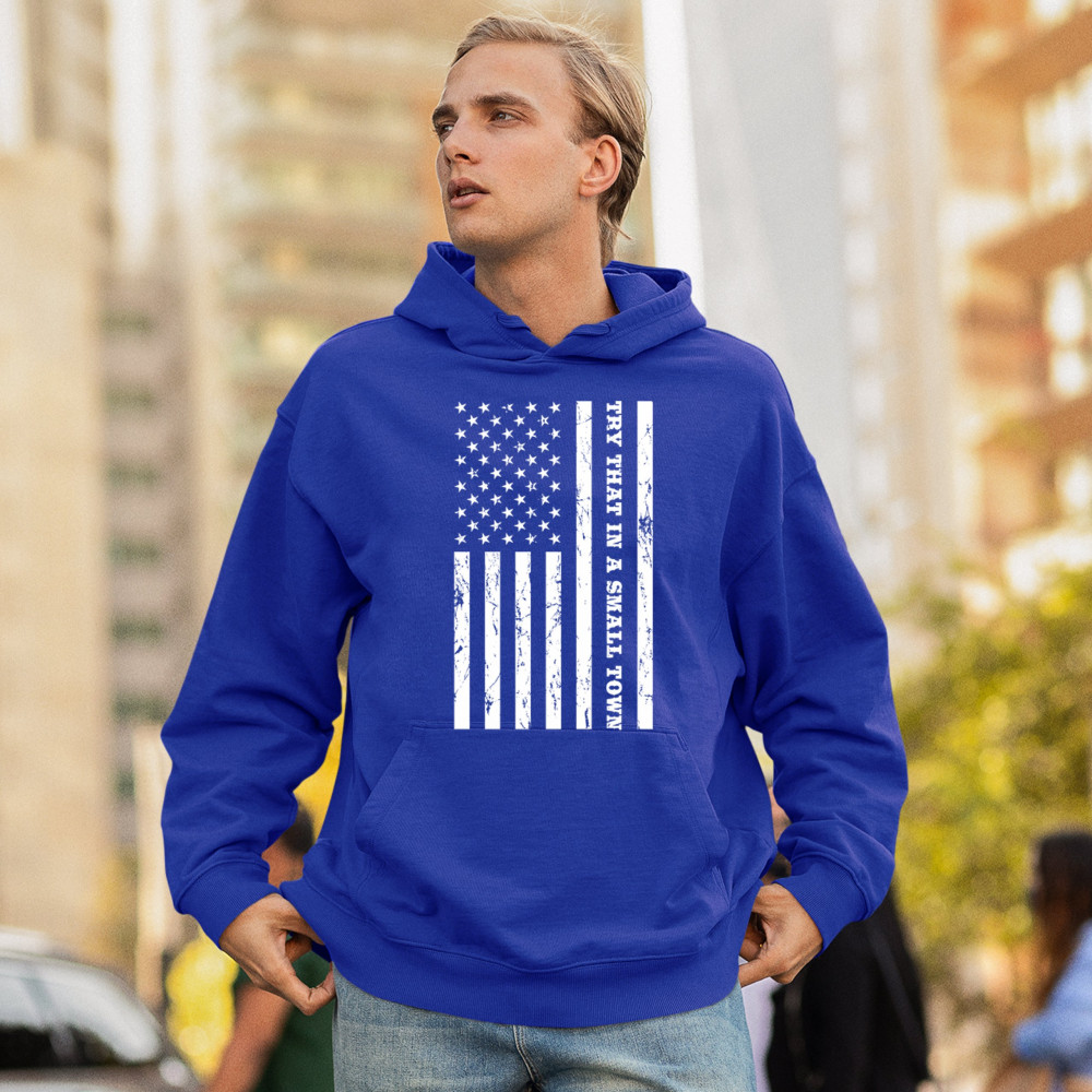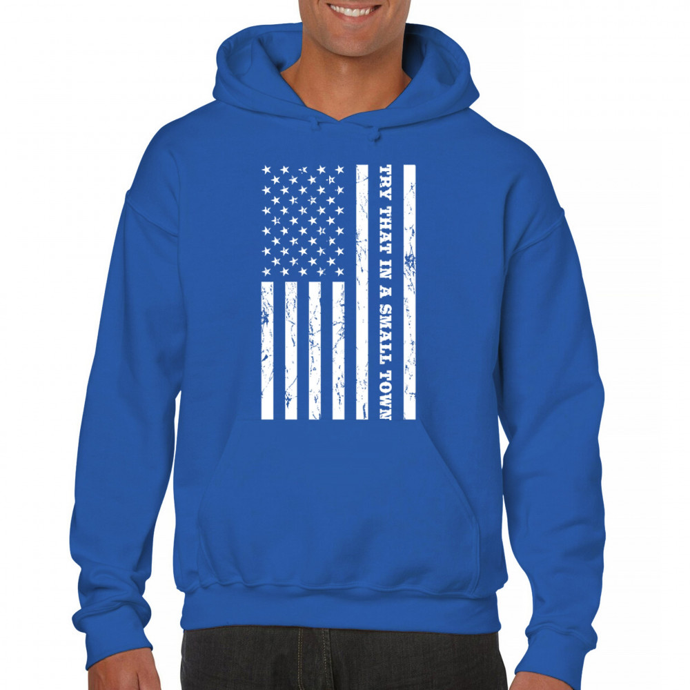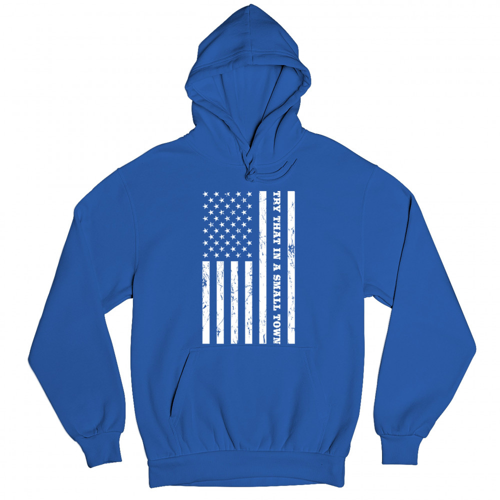 TRY THAT IN A SMALL TOWN GRUNGE AMERICAN FLAG sweatshirt patriotic hoodie royal blue
