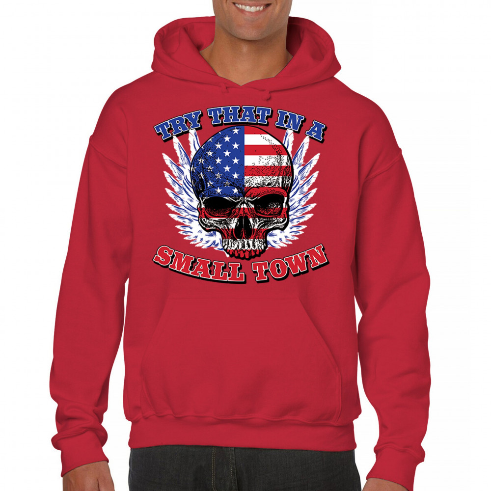 TRY THAT IN A SMALL TOWN sweatshirt american flag skull country music hoodie red