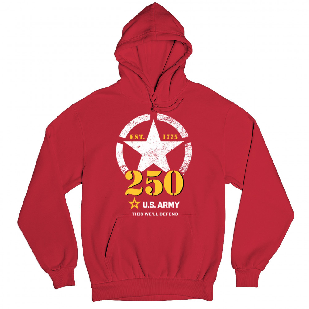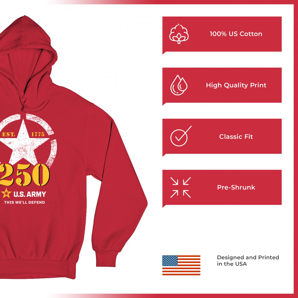 Celebrate 250 years of U.S. Army duty and pride with bold stencil design, EST 1775 mark, and patriotic “This We’ll Defend†motto.
