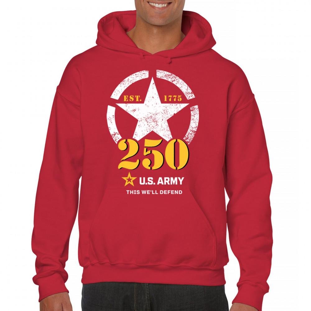 Boldly marking the U.S. Army’s 250th anniversary, this design includes a distressed white star, 1775 EST detail, and bold yellow “250†typeface beneath the iconic motto “This We’ll Defend.†A fitting tribute for veterans, service members, and families who want to show respect and pride during military observances or patriotic events.