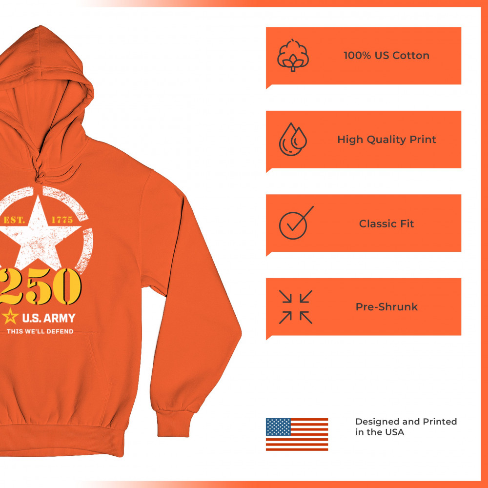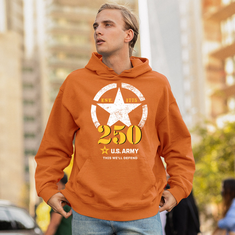 Celebrate 250 years of U.S. Army duty and pride with bold stencil design, EST 1775 mark, and patriotic “This We’ll Defend†motto.