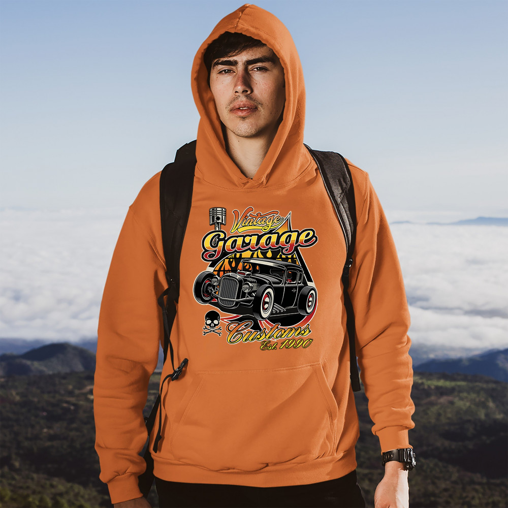 A print featuring a lowrider hot rod, a small skull with crossed wrenches instead of bones, a piston and an ace of spades in the background. The orint says: "Vintage Garage Customs Est. 1990". A great choice for a fan of customized American classic cars a