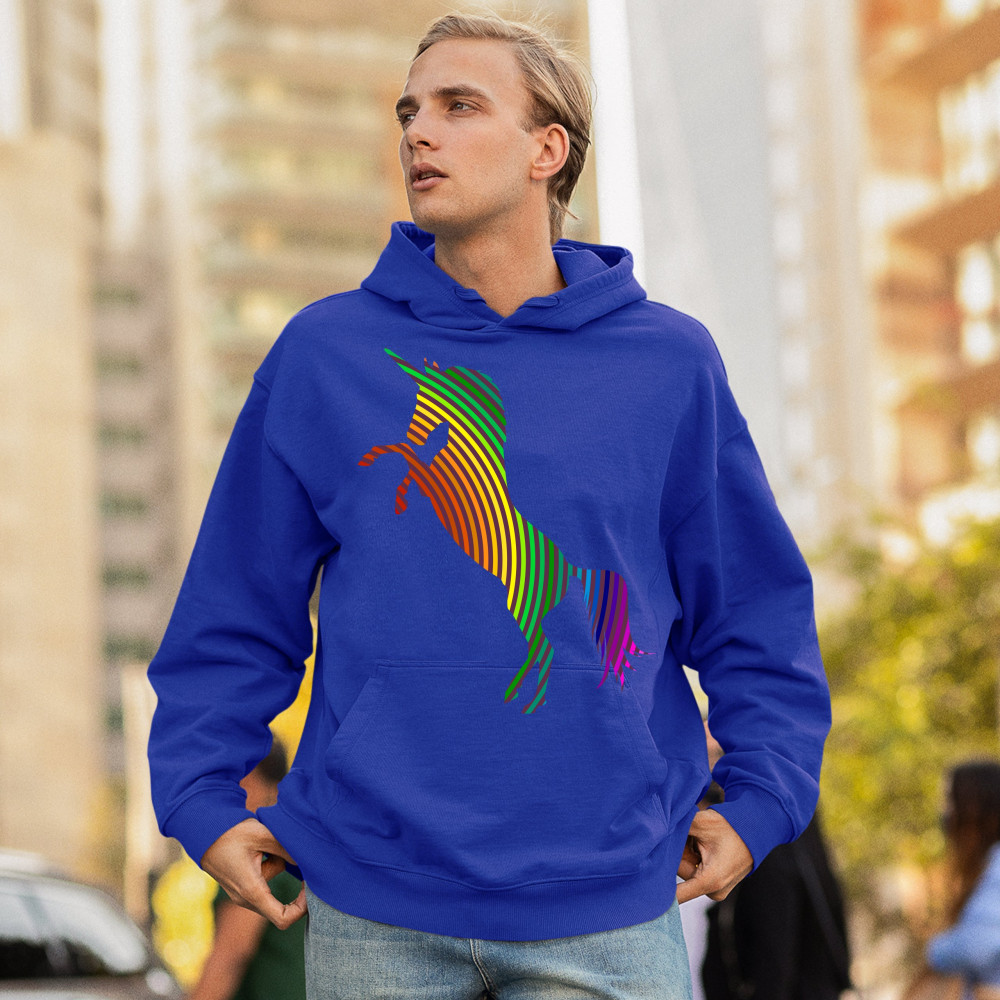 The print depicts a strong rearing unicorn. The unicorn is painted in vivid rainbow-stripe colors. This can symbolize a strong spirit of the sexual and gender minority.