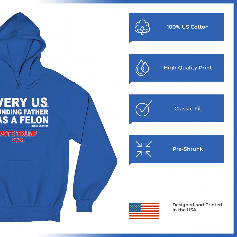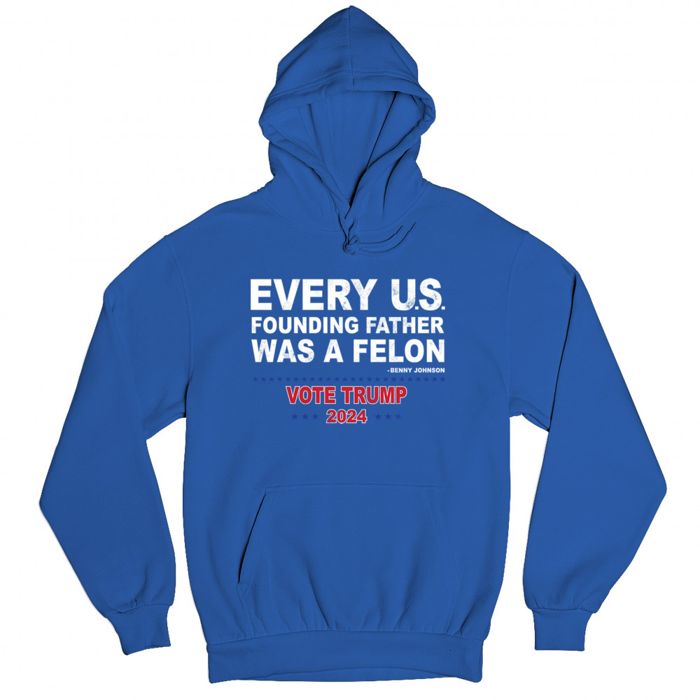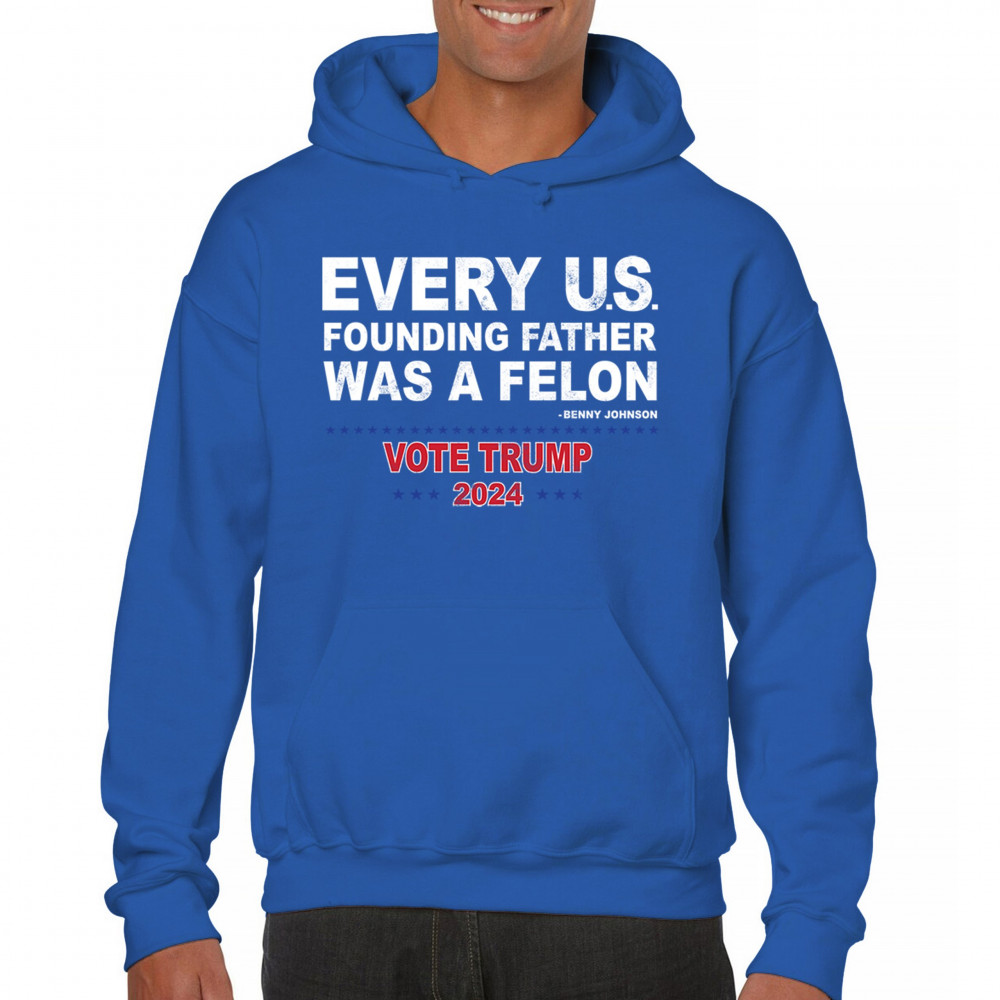 Show your support for Trump 2024 with a bold design quoting "Every U.S. founding father was a felon." Stand against political attacks and support an America-first vision.