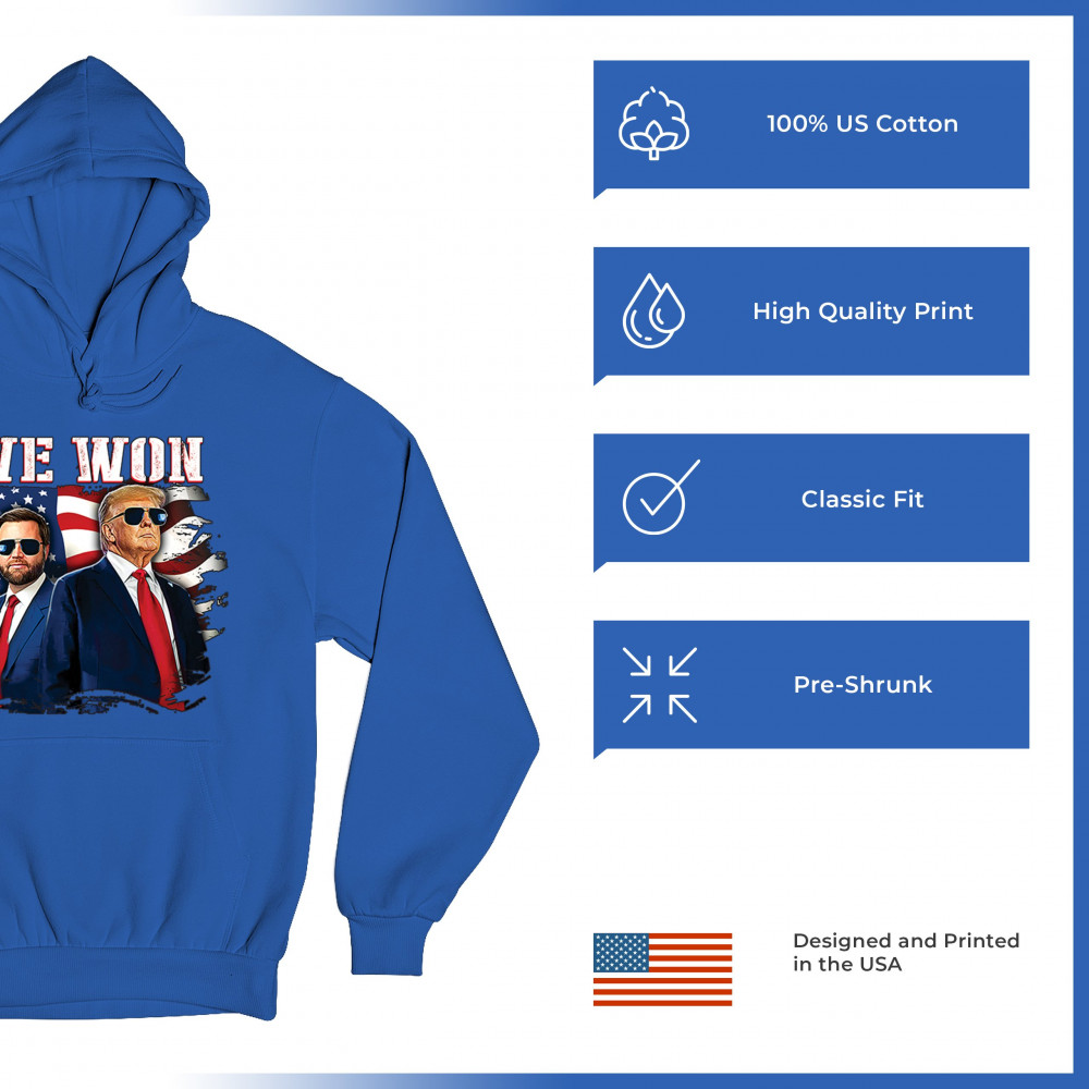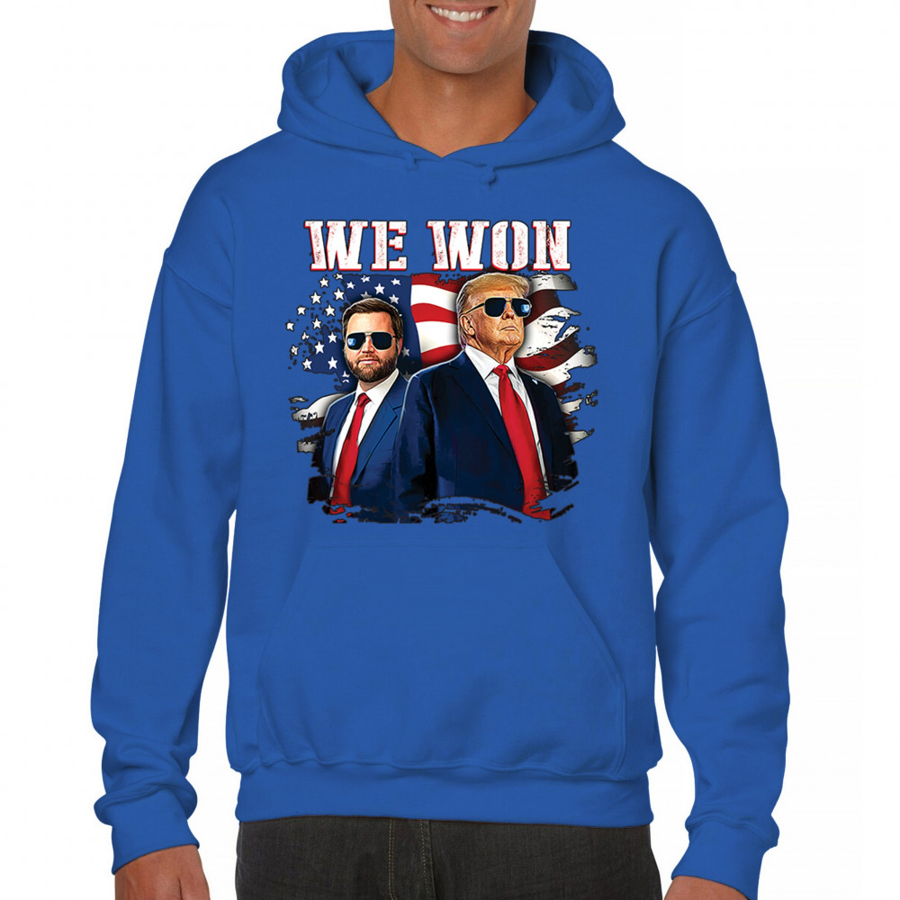 Celebrate Republican victory with this bold "We Won" design featuring Trump and patriotic flair—perfect for rallies, events, and patriotic pride.