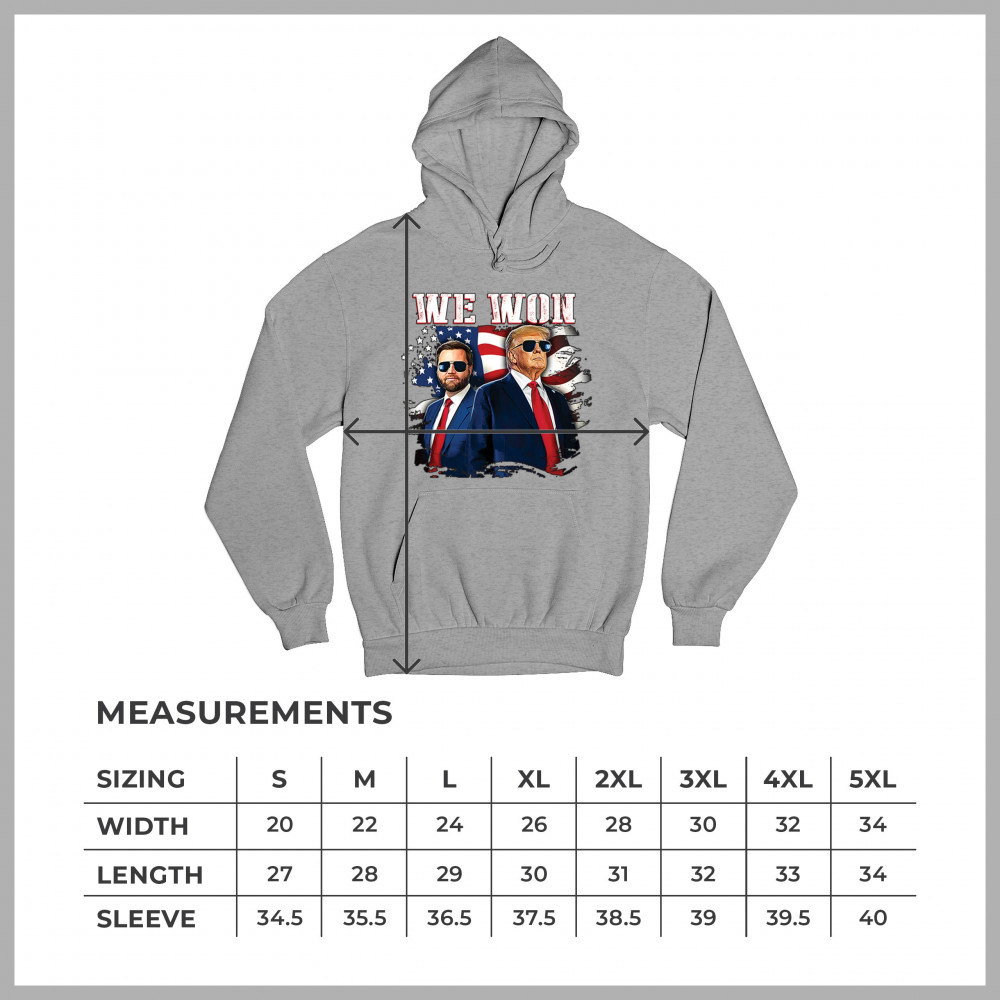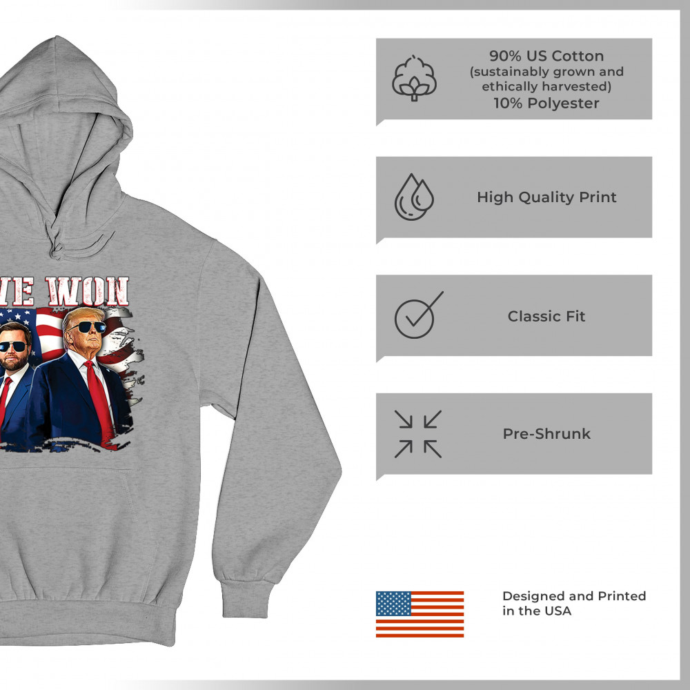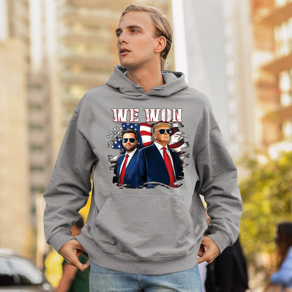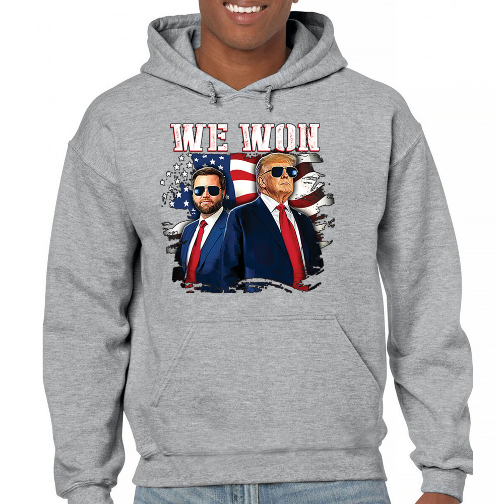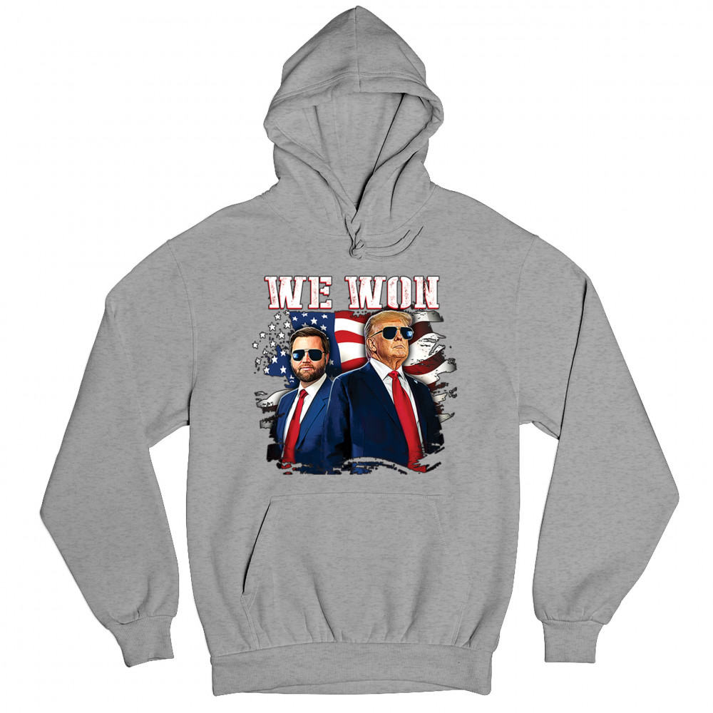 Celebrate Republican victory with this bold "We Won" design featuring Trump and patriotic flair—perfect for rallies, events, and patriotic pride.
