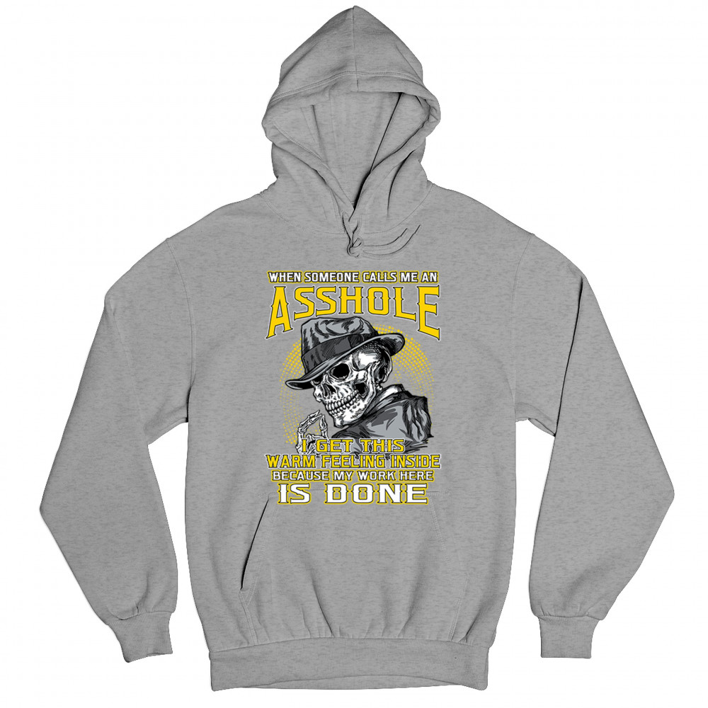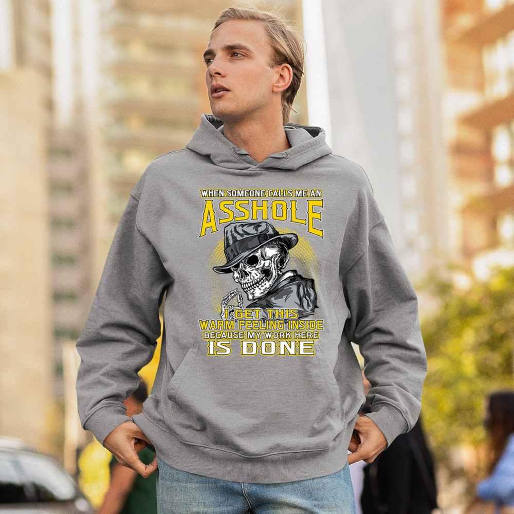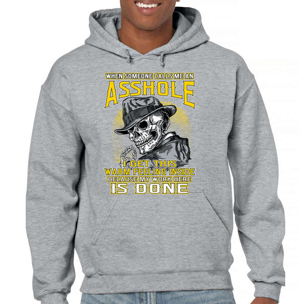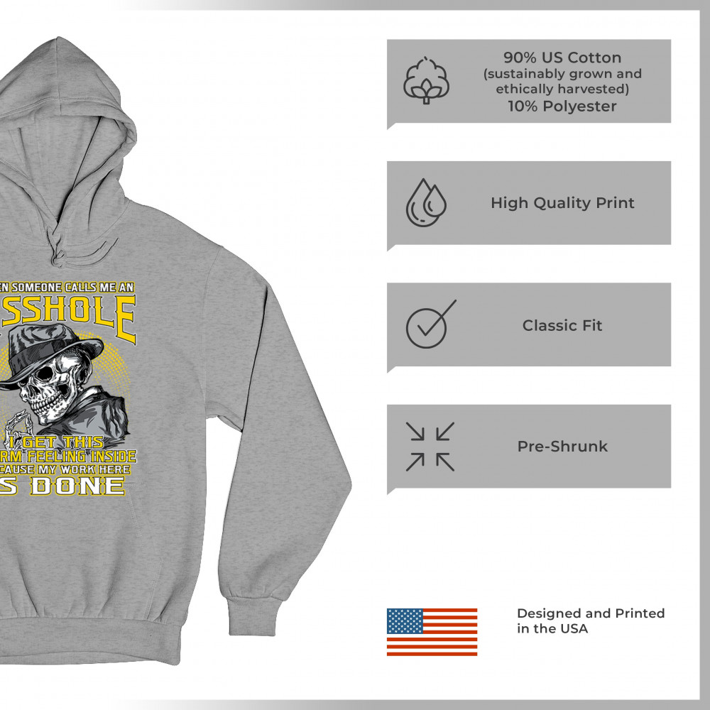 This badass design features a smirking skull in a fedora with a cigarette, backed by the line: “When someone calls me an asshole... my work here is done.†Built for dark humor fans, skull art lovers, and those who live life with sharp wit and zero regrets. Ideal for biker rallies, sarcasm nights, or anyone owning their attitude with pride.
