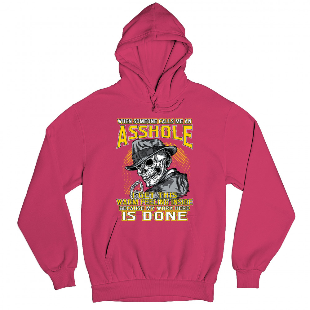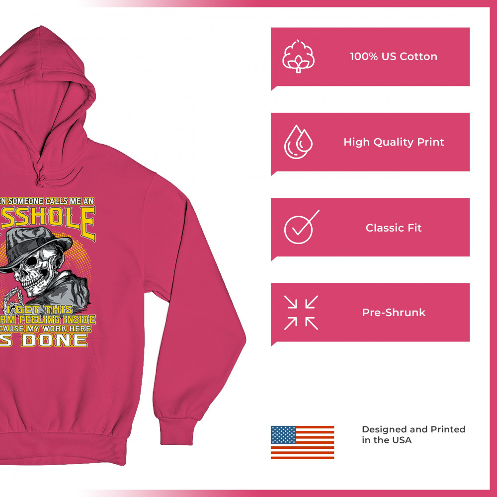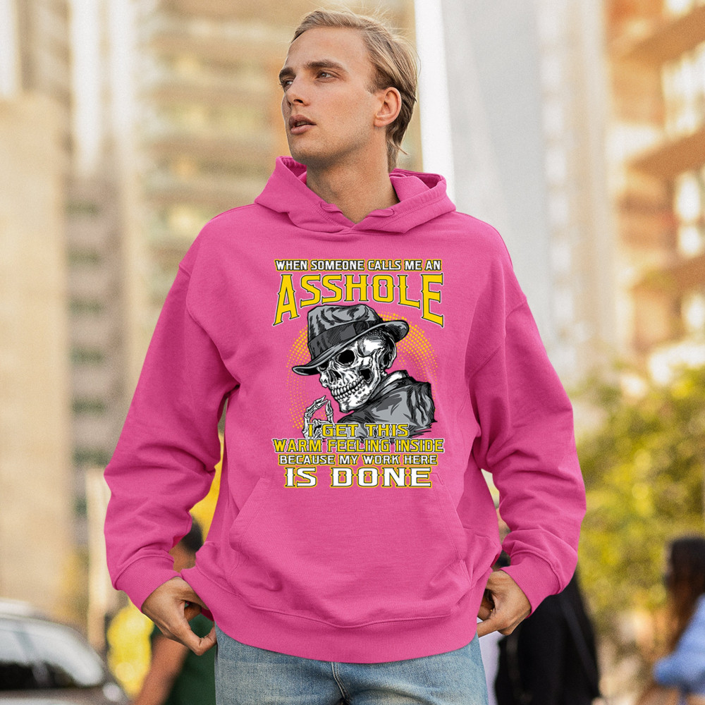 This badass design features a smirking skull in a fedora with a cigarette, backed by the line: “When someone calls me an asshole... my work here is done.†Built for dark humor fans, skull art lovers, and those who live life with sharp wit and zero regrets. Ideal for biker rallies, sarcasm nights, or anyone owning their attitude with pride.