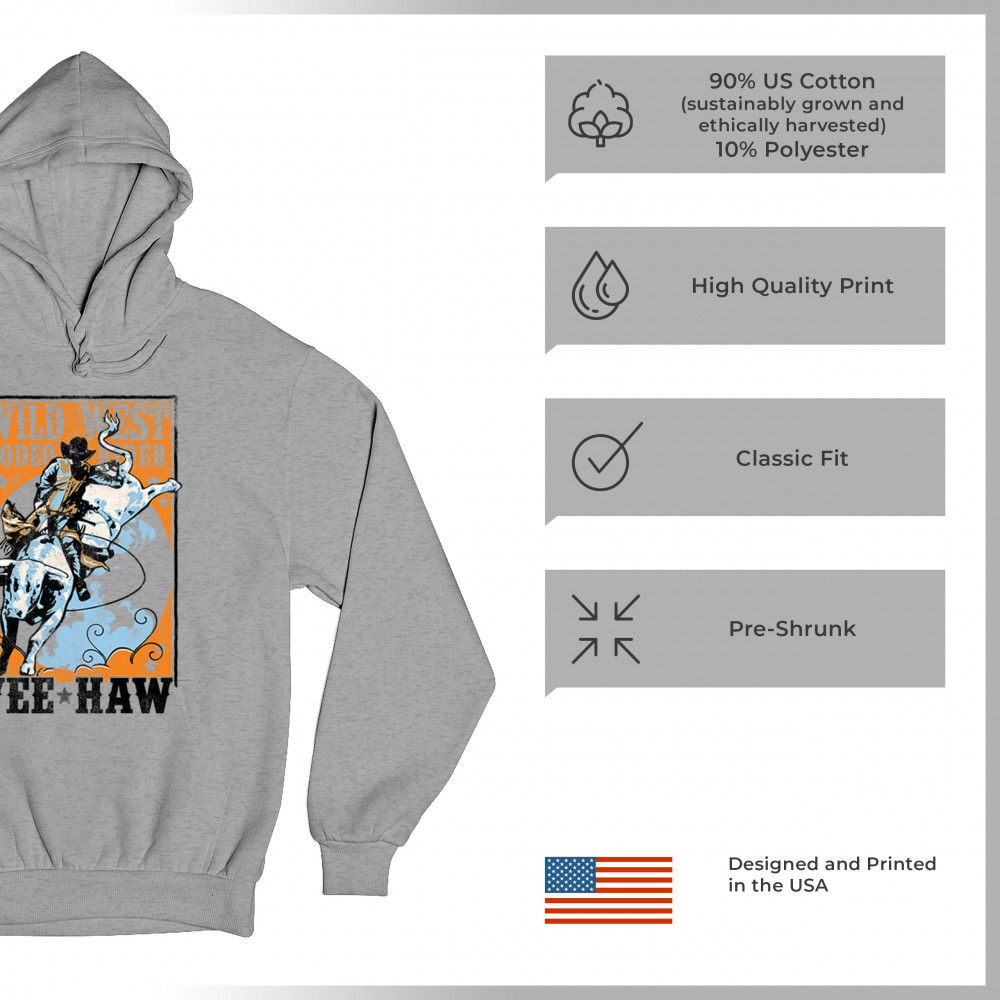 Bold cowboy bull riding design with orange backdrop, perfect for rodeo fans, western events, and country festivals.