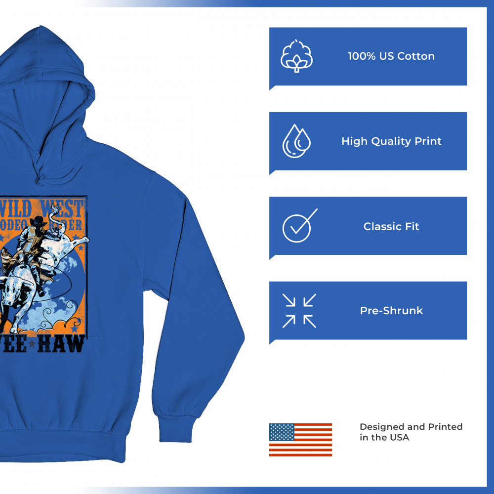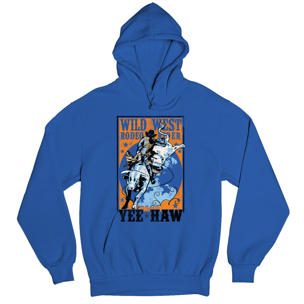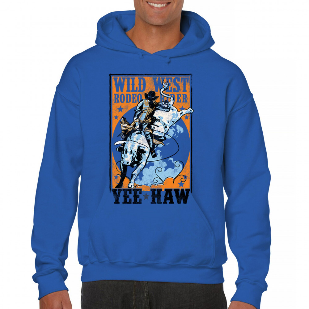 Bold cowboy bull riding design with orange backdrop, perfect for rodeo fans, western events, and country festivals.