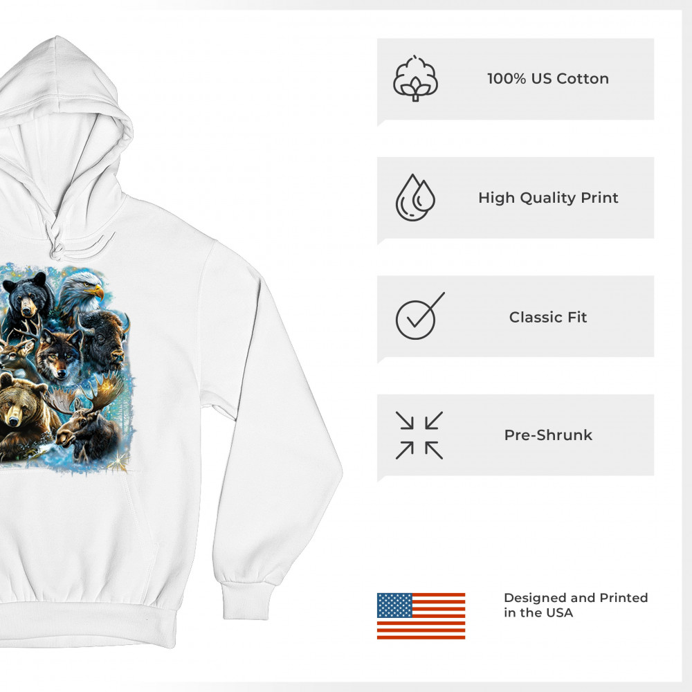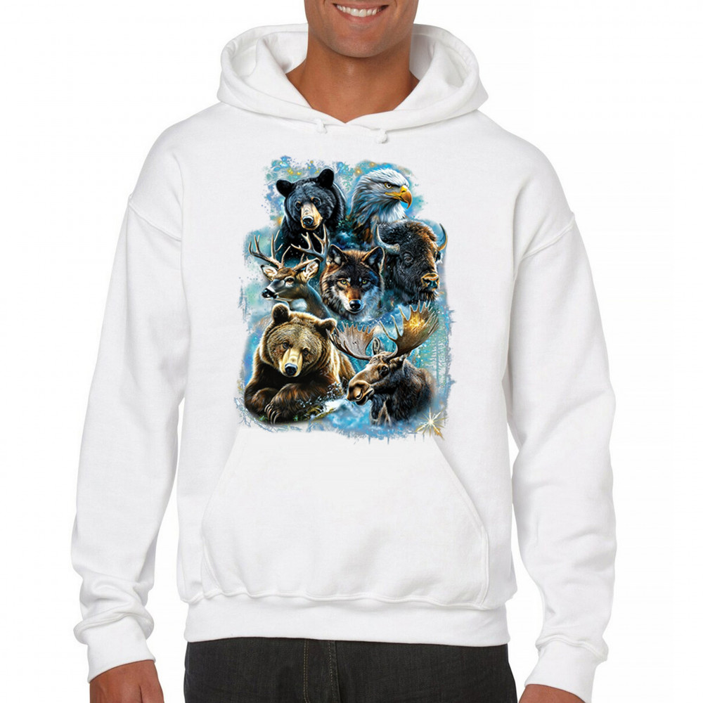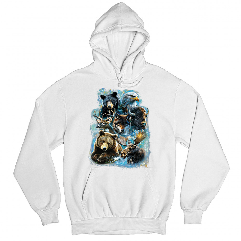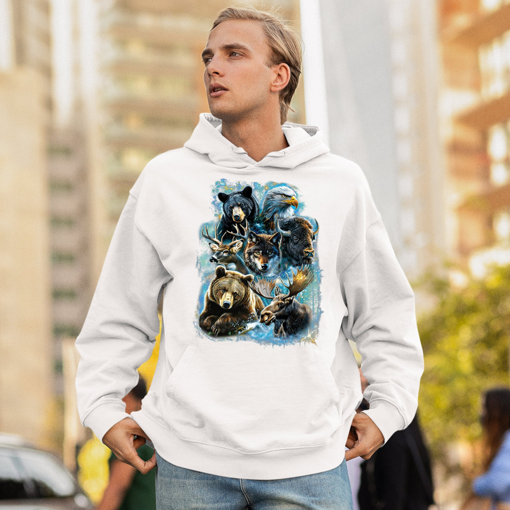 Wilderness design with moose, bear, eagle, bison, and wolf. A bold tribute to forest animals, nature strength, and rugged outdoor spirit.