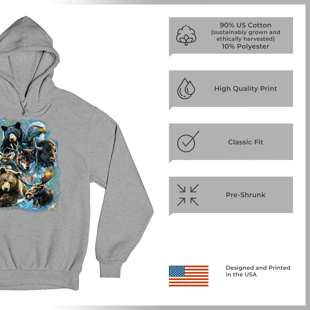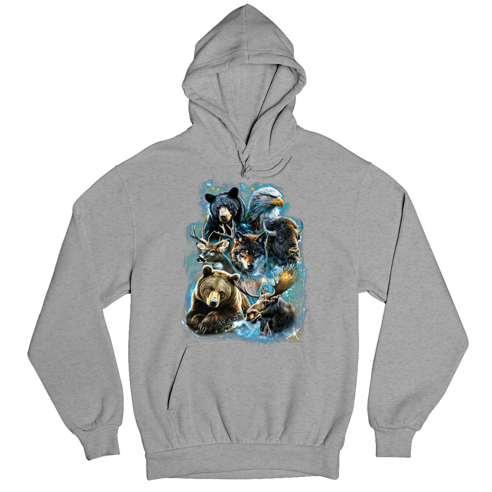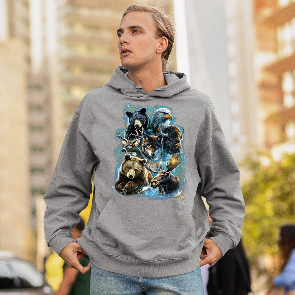 Wilderness design with moose, bear, eagle, bison, and wolf. A bold tribute to forest animals, nature strength, and rugged outdoor spirit.