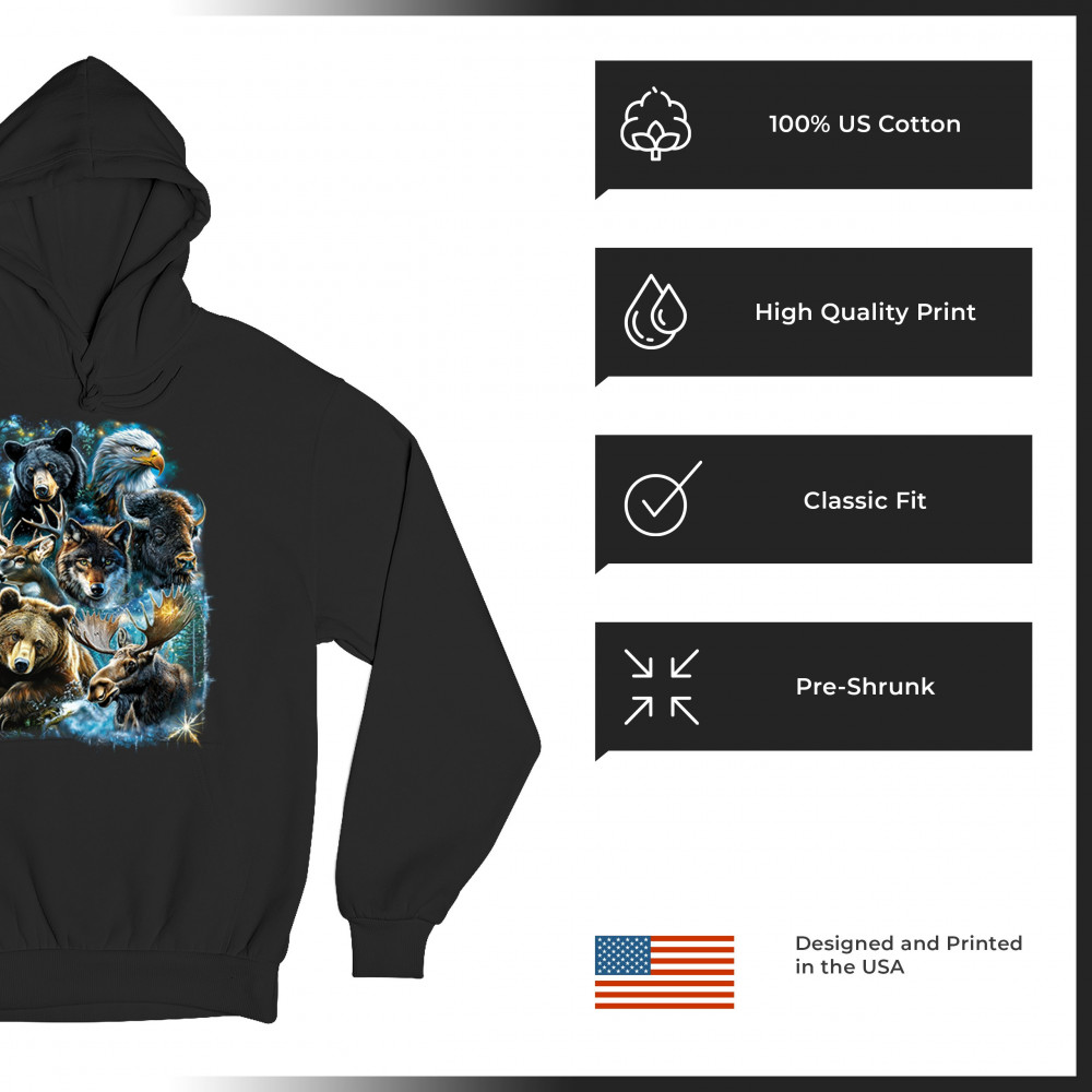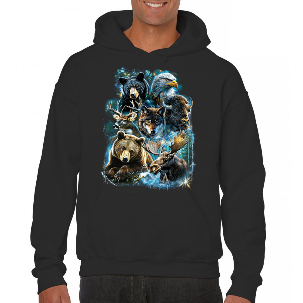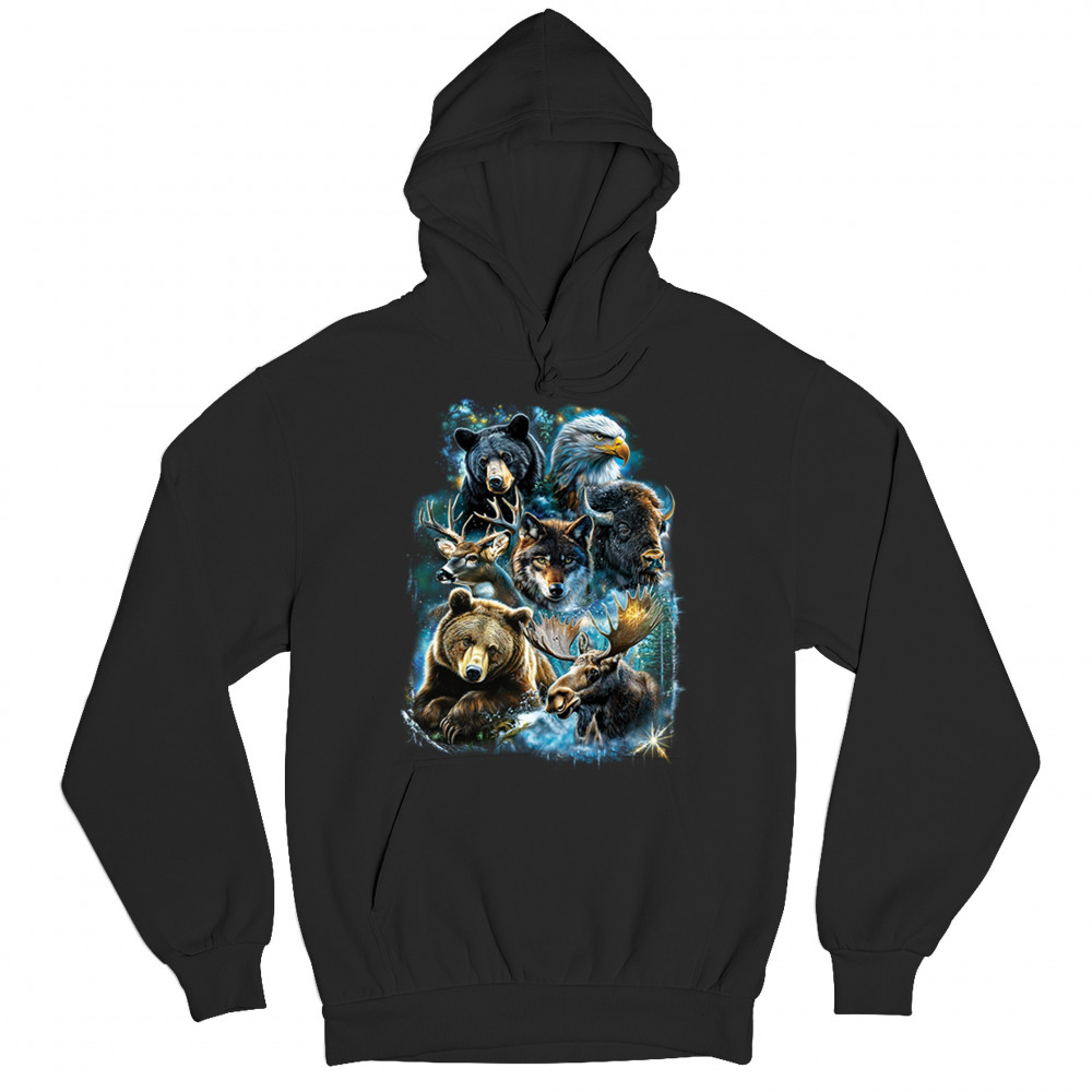 Wilderness design with moose, bear, eagle, bison, and wolf. A bold tribute to forest animals, nature strength, and rugged outdoor spirit.