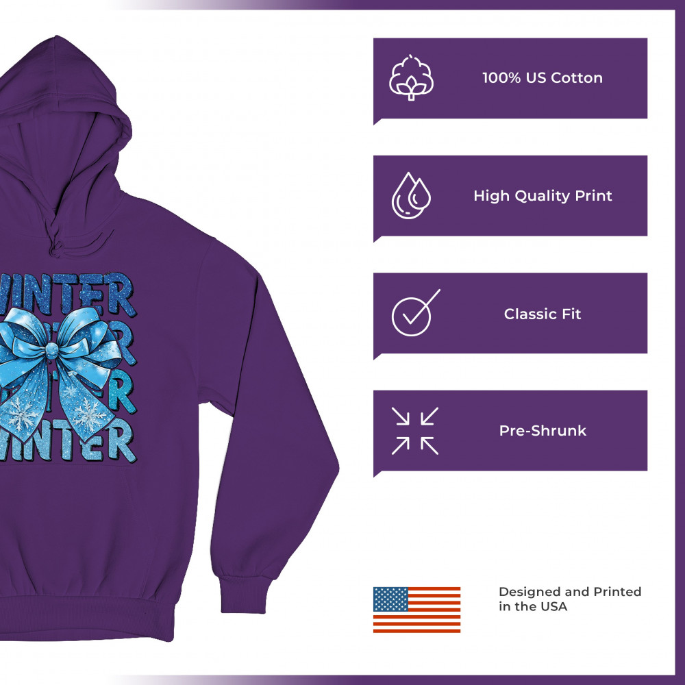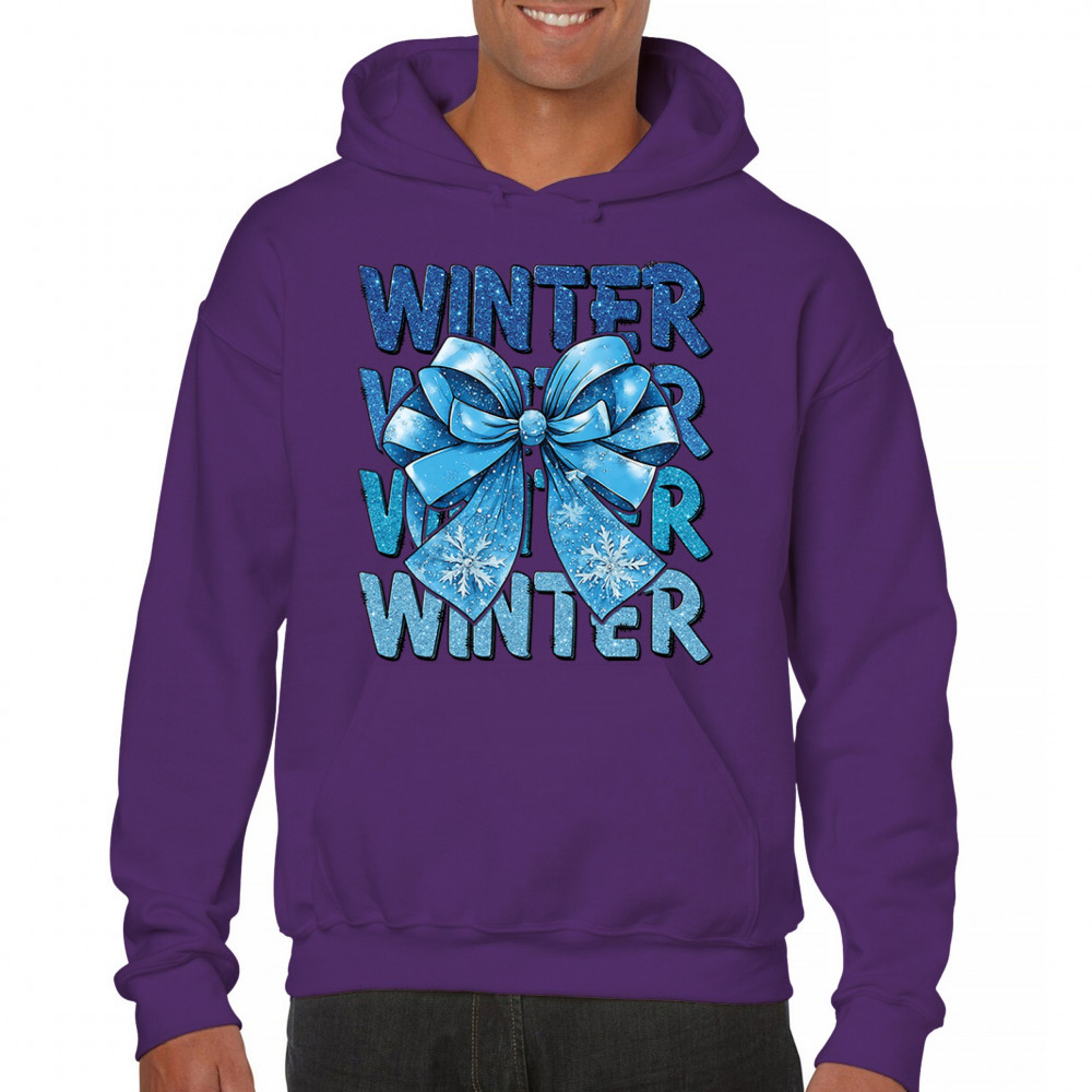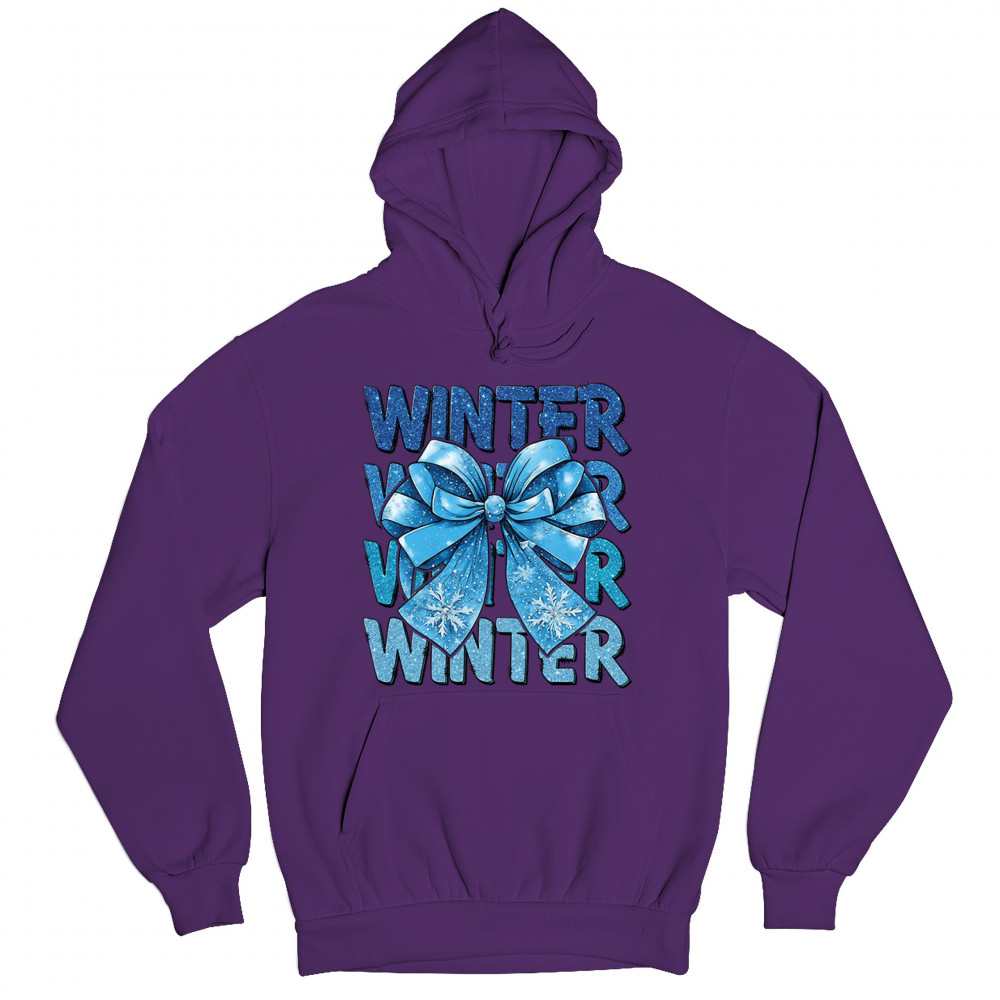 This shimmering winter bow design blends icy blue glitter style with bold repeating WINTER text for a bright seasonal statement. Snowflake accents and frosty tones create a cozy, cheerful vibe perfect for holiday outfits, gifting, or cold-weather lovers. A standout graphic that brings festive winter charm to any wardrobe and boosts seasonal search visibility.