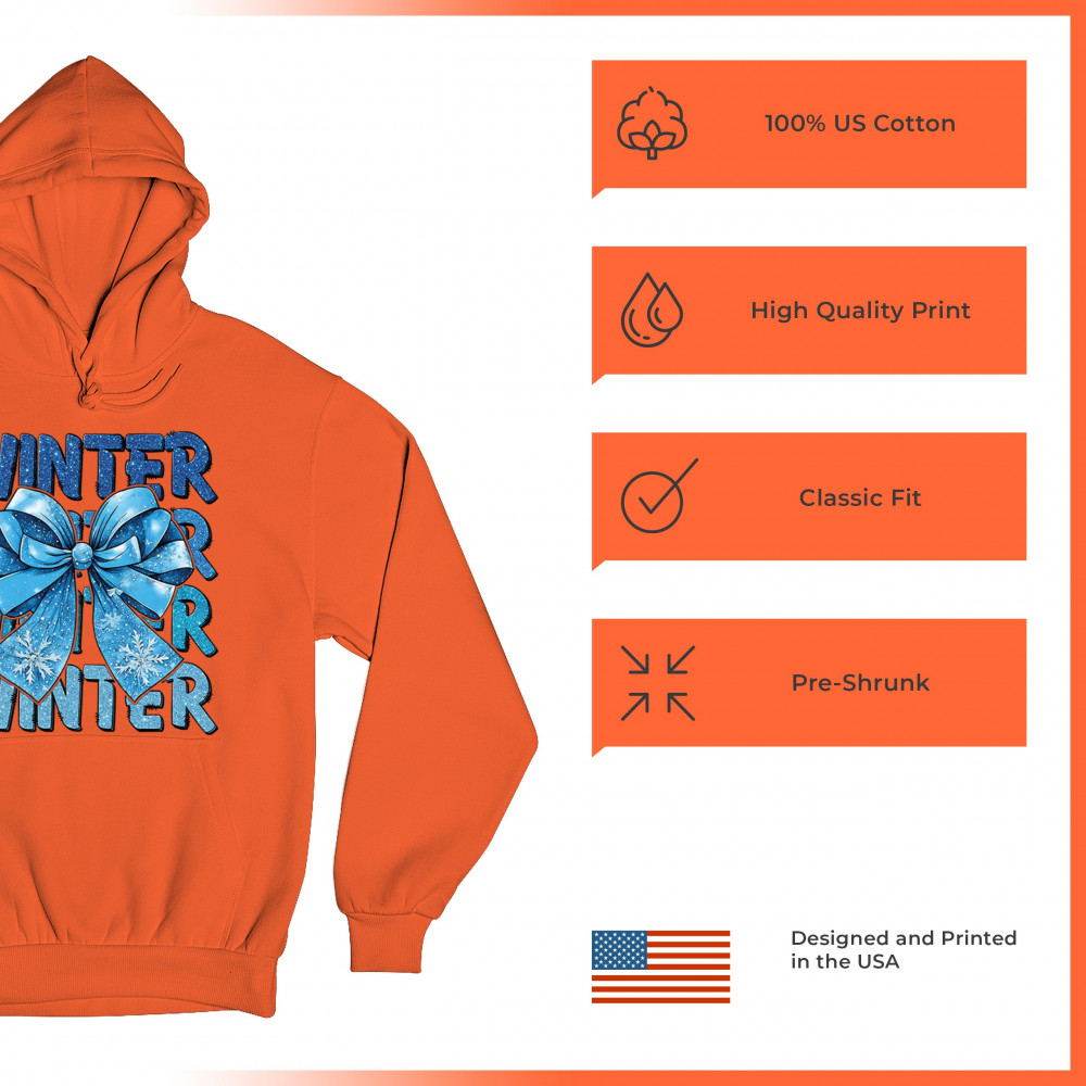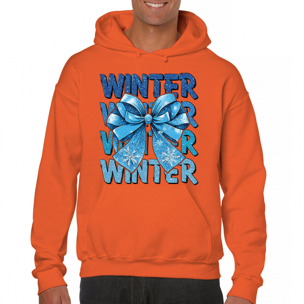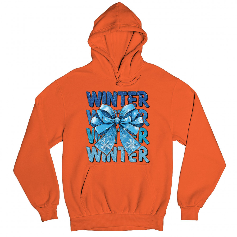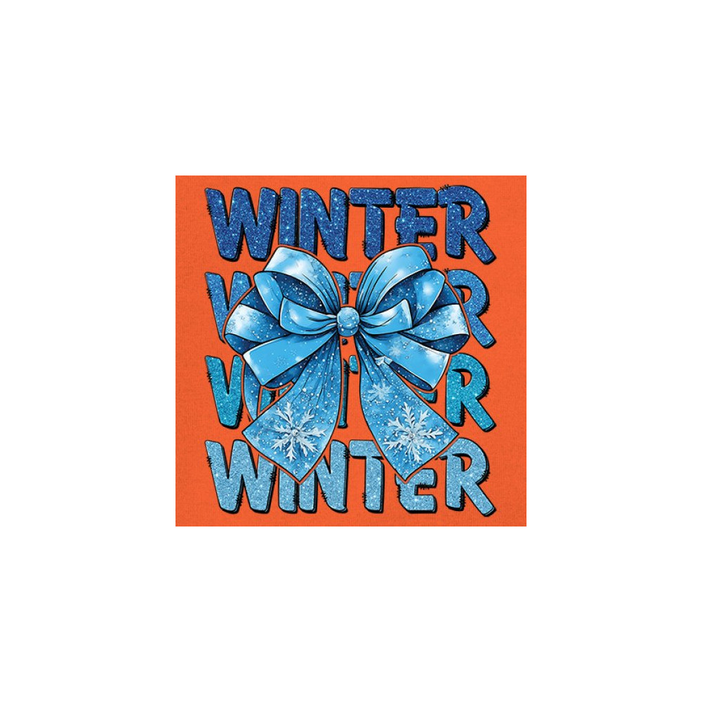 This shimmering winter bow design blends icy blue glitter style with bold repeating WINTER text for a bright seasonal statement. Snowflake accents and frosty tones create a cozy, cheerful vibe perfect for holiday outfits, gifting, or cold-weather lovers. A standout graphic that brings festive winter charm to any wardrobe and boosts seasonal search visibility.