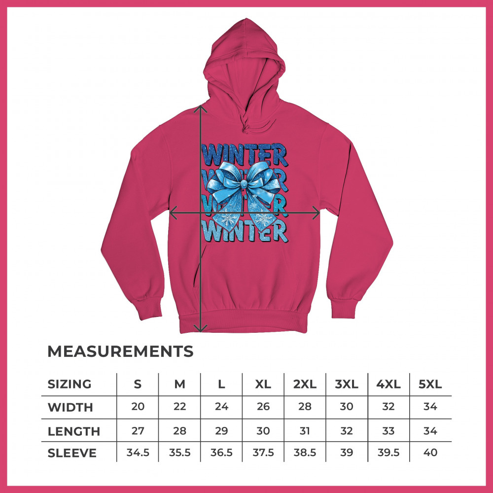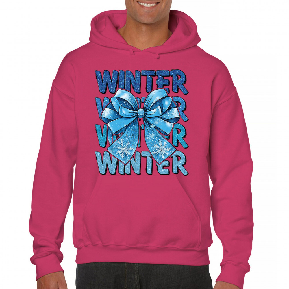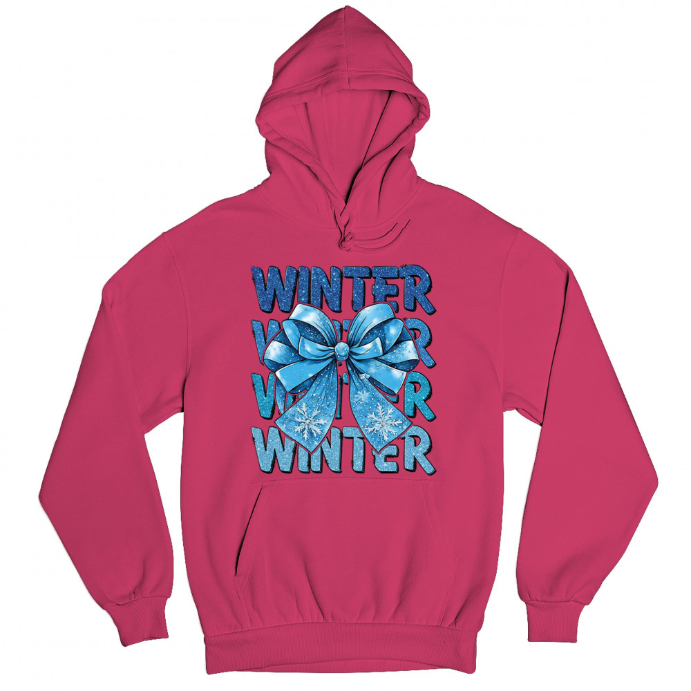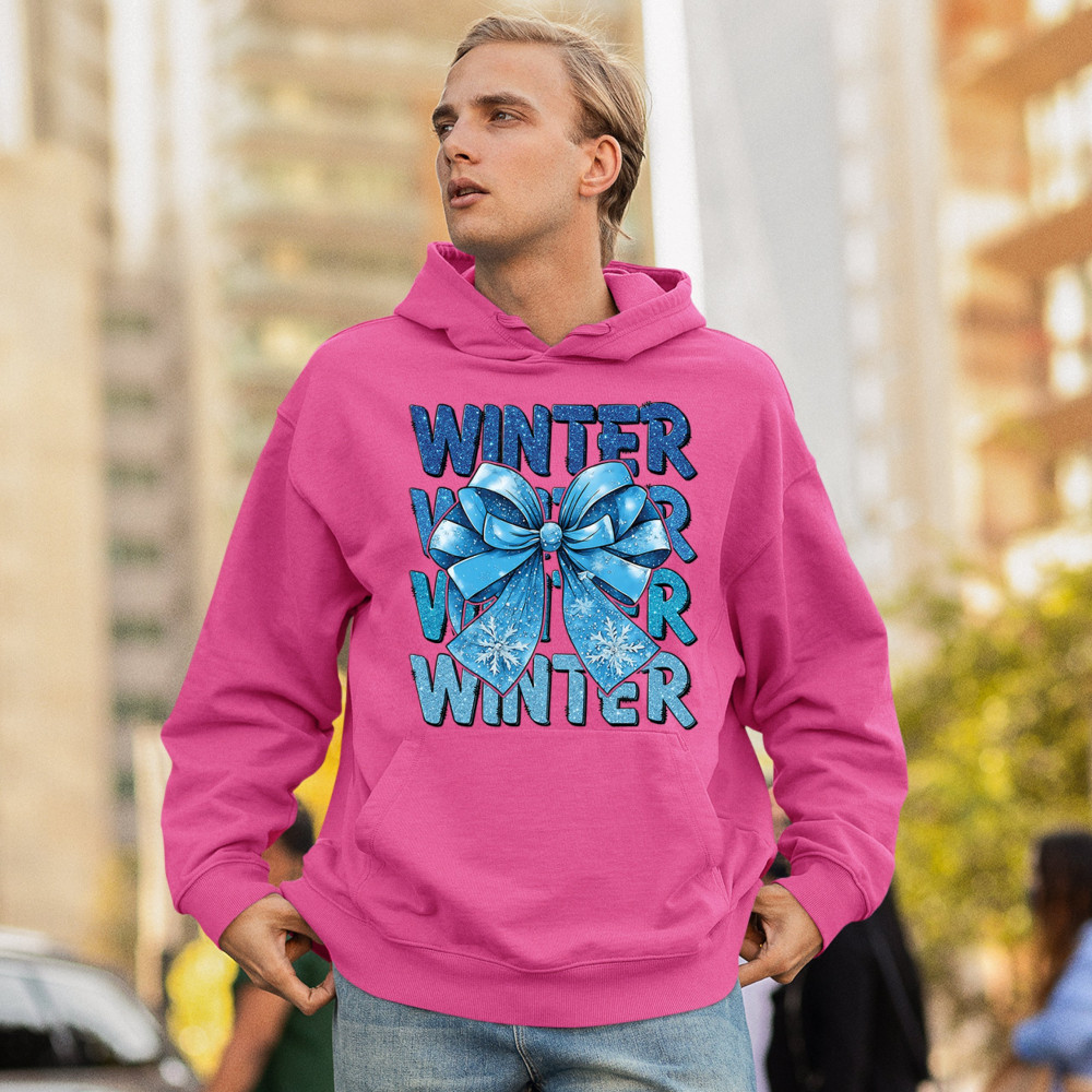 This shimmering winter bow design blends icy blue glitter style with bold repeating WINTER text for a bright seasonal statement. Snowflake accents and frosty tones create a cozy, cheerful vibe perfect for holiday outfits, gifting, or cold-weather lovers. A standout graphic that brings festive winter charm to any wardrobe and boosts seasonal search visibility.