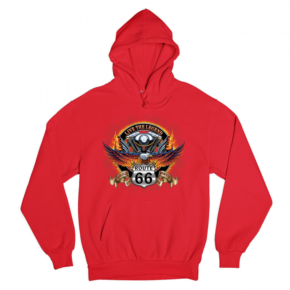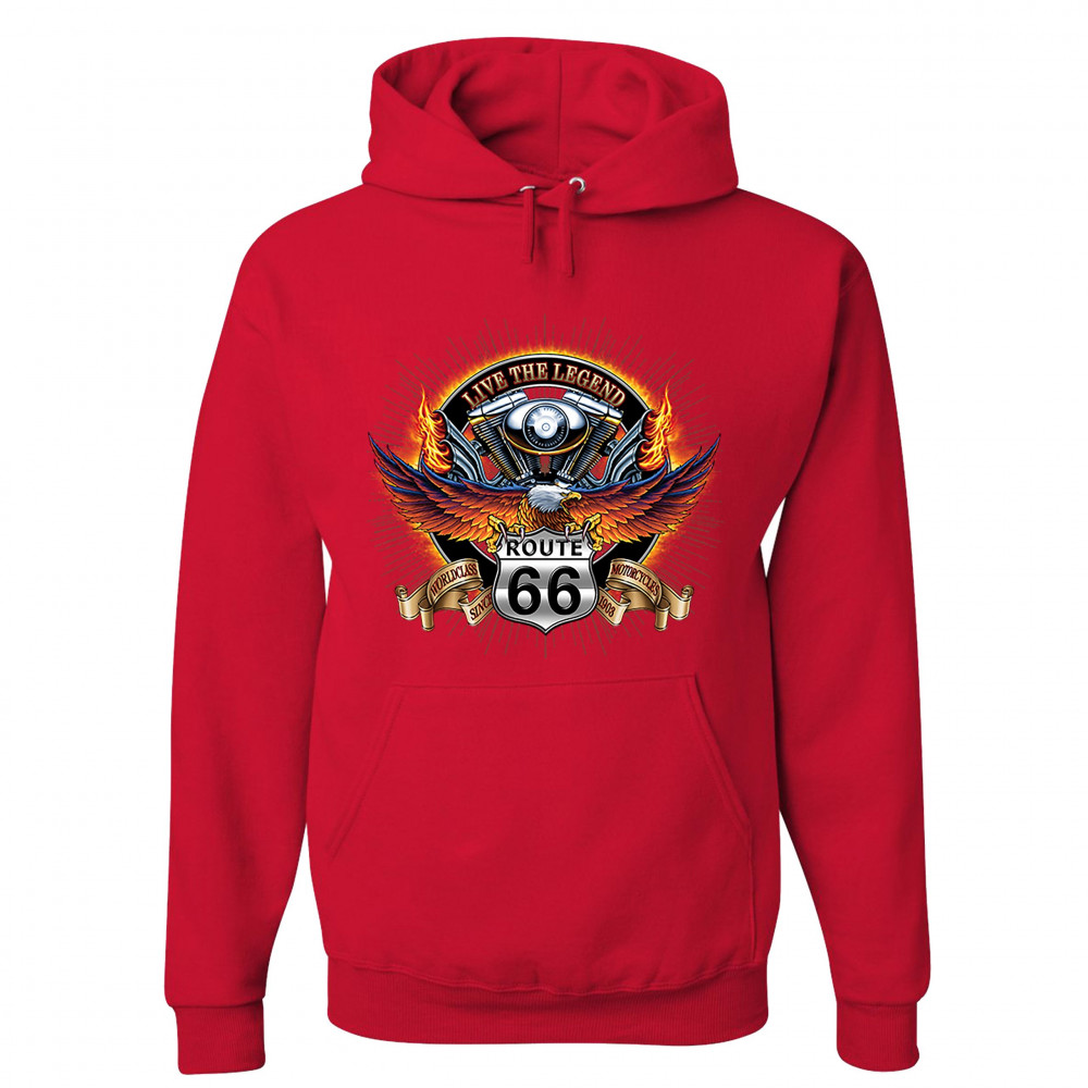 A print featuring an American bald eagle spreading it's wings while sitting on a "Route 66" sign. On a stripe behind the sign it says: "worldclass motorcycles since 1903". In the background there is a motorcycle engine with words: "live the legend" above