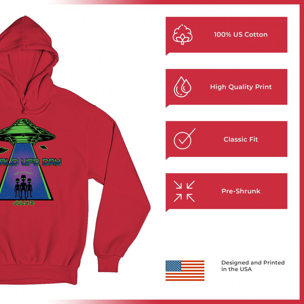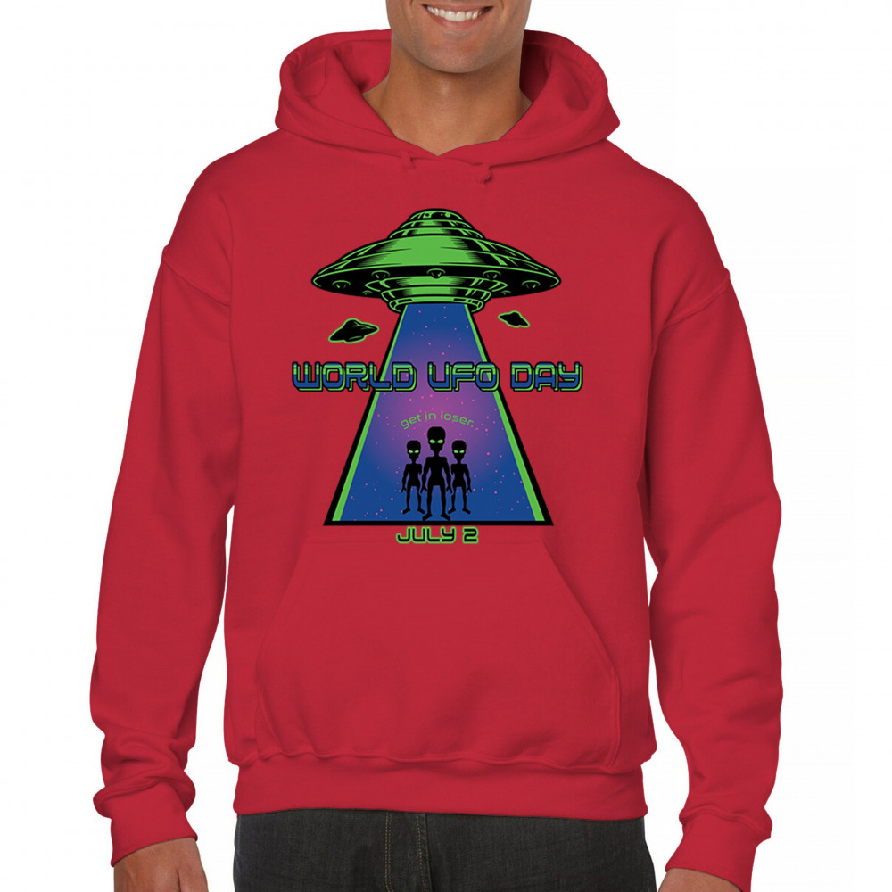 Join the celebration of World UFO Day with this unique design, featuring a detailed UFO beaming up three cheerful aliens with the phrase "Get in, loser." Perfect for those who are fascinated by the unknown and have a sense of humor about extraterrestrial life. Whether you're attending a UFO event, meeting with fellow enthusiasts, or just want to express your quirky style, this design is a must-have. Embrace the spirit of curiosity and fun with this eye-catching design for July 2nd.