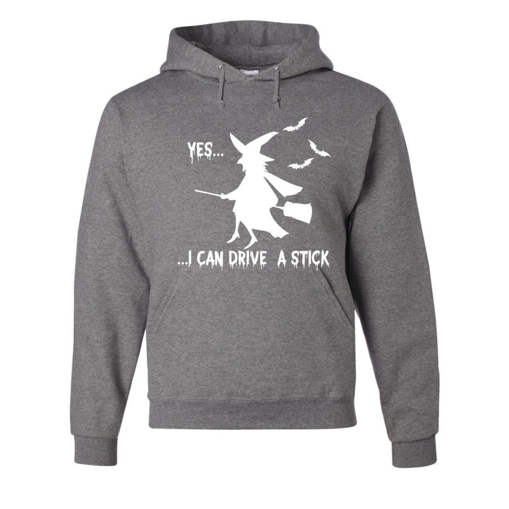 YES, I CAN DRIVE A STICK hoodie funny halloween witch sweatshirt gray