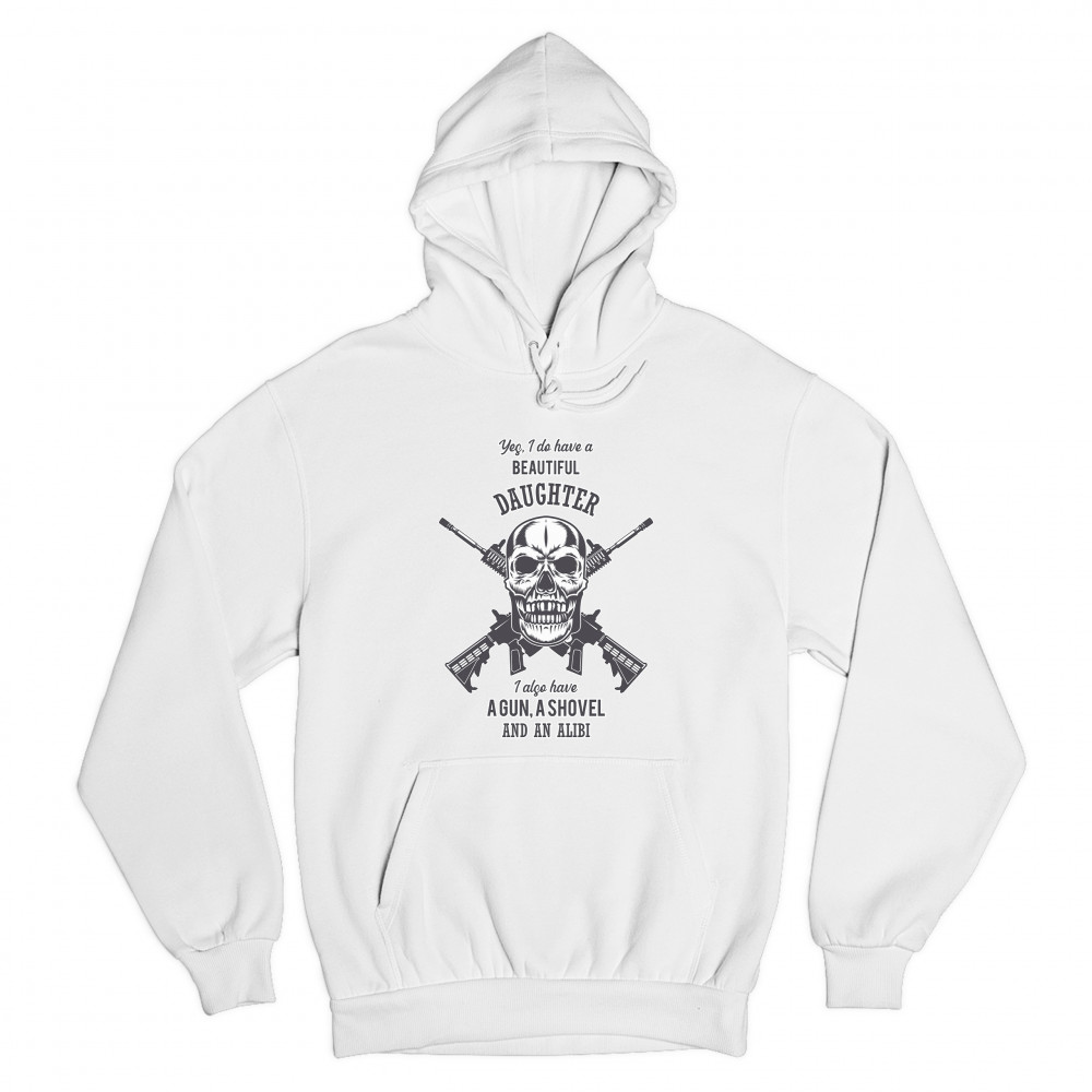 A funny print featuring a scary skull facing forward; behind it there are two crossed rifles. The print says: "Yes, I do have a beautiful daughter. I also have a gun, a shovel and an alibi". Great choice as a gift for Father's Day celebration.
