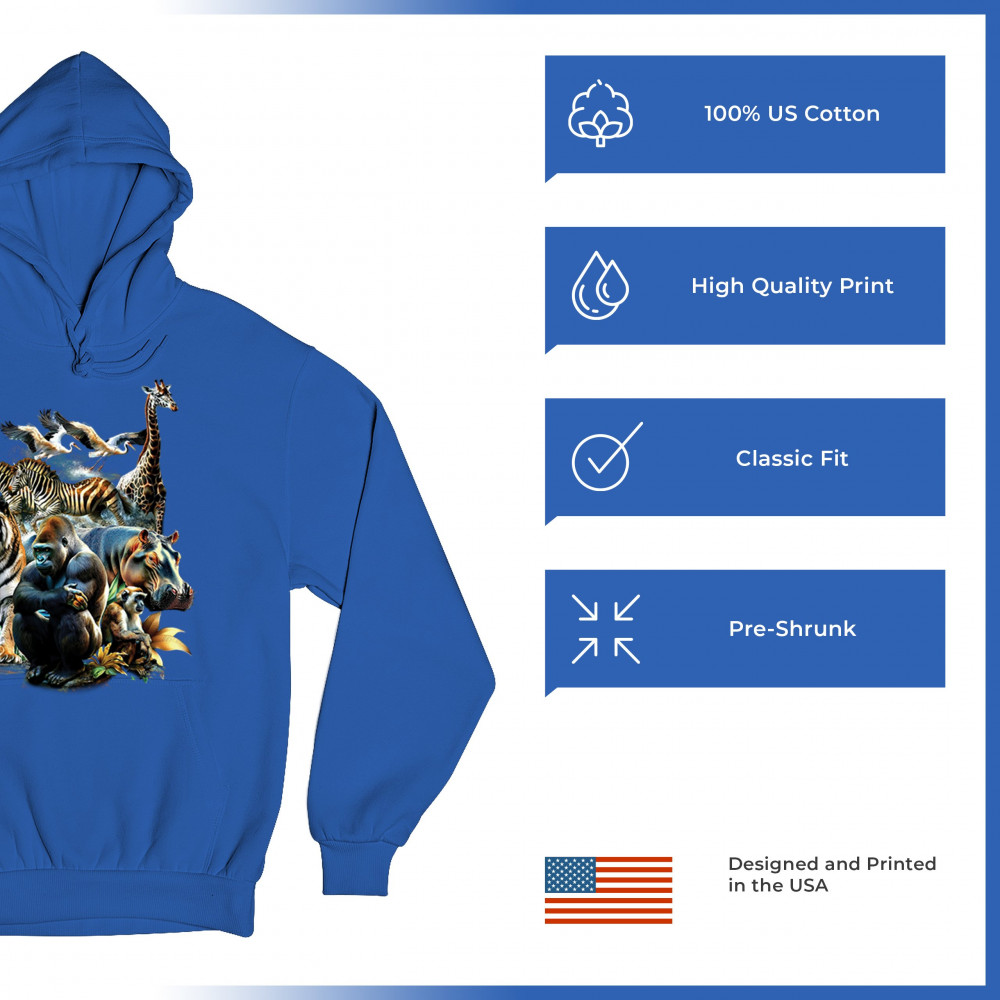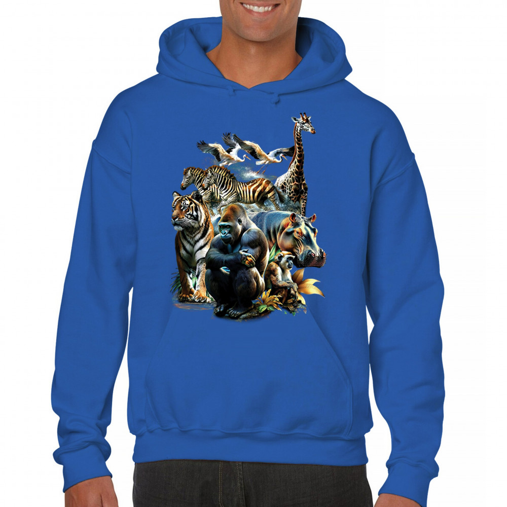 Packed with fierce energy and vibrant color, this wildlife design features a jungle coalition of gorilla, tiger, monkey, zebra, giraffe, hippo, and birds. A powerful tribute to animal beauty, biodiversity, and nature's harmony. Perfect for jungle tour enthusiasts, zoo visitors, or anyone passionate about wild conservation and stunning creature art.