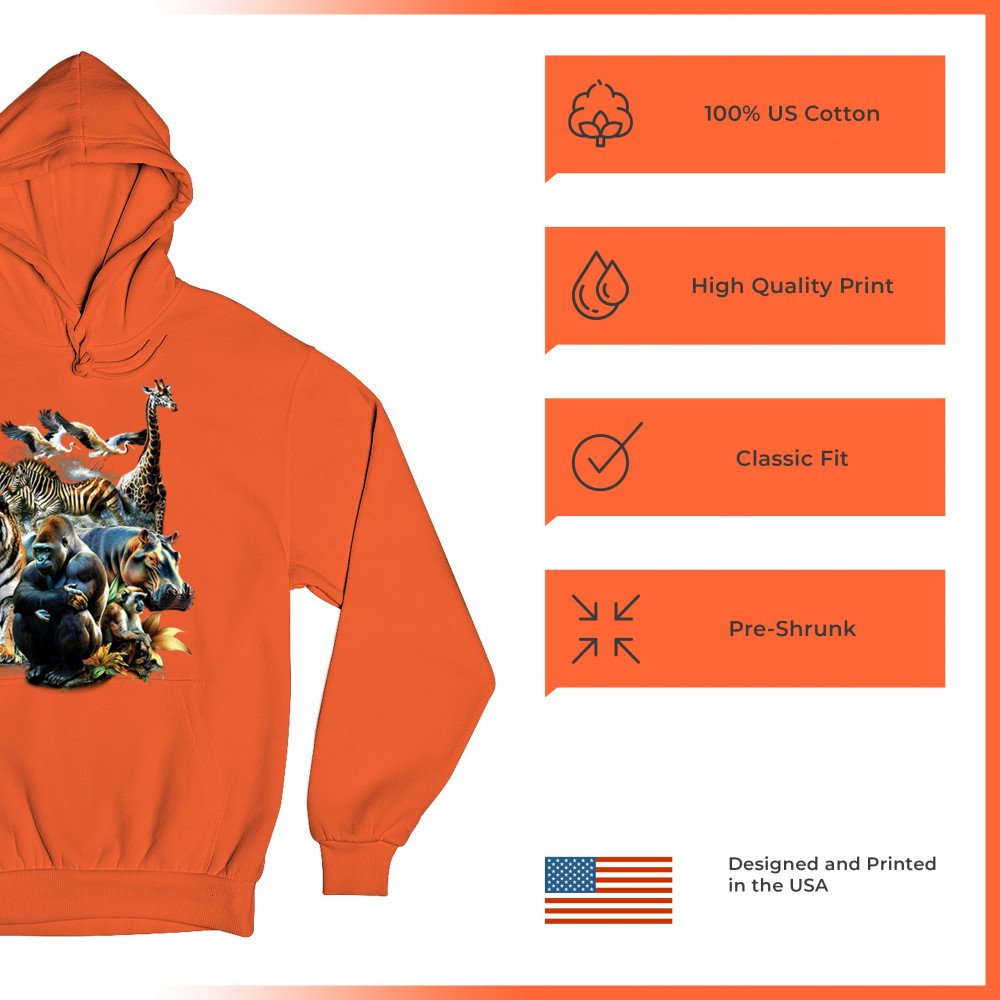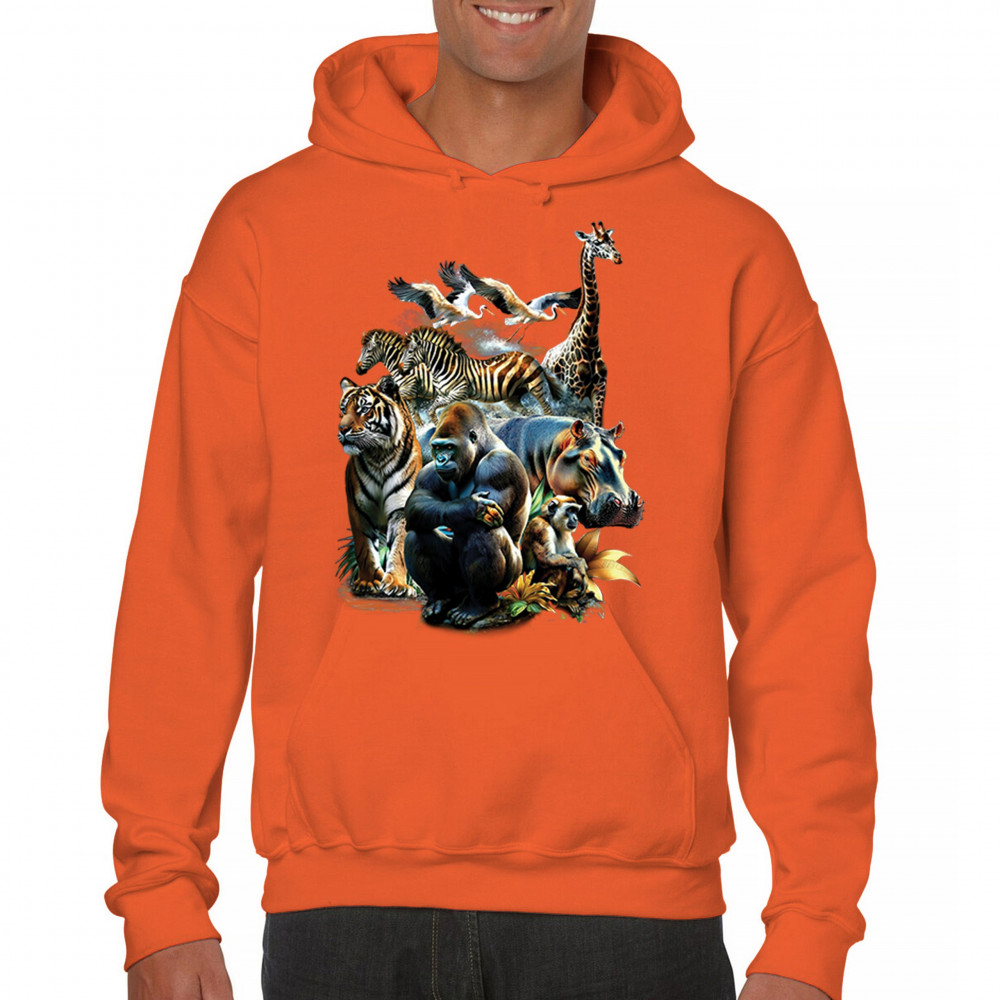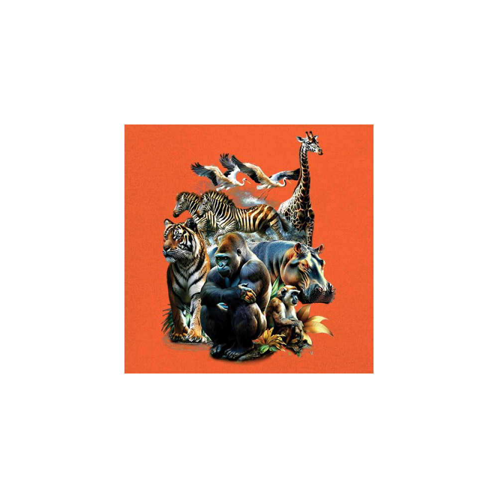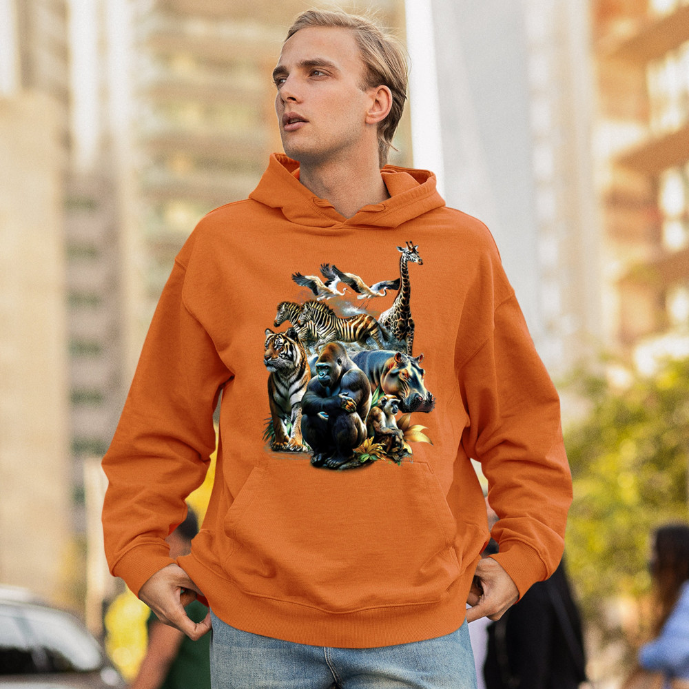 Packed with fierce energy and vibrant color, this wildlife design features a jungle coalition of gorilla, tiger, monkey, zebra, giraffe, hippo, and birds. A powerful tribute to animal beauty, biodiversity, and nature's harmony. Perfect for jungle tour enthusiasts, zoo visitors, or anyone passionate about wild conservation and stunning creature art.