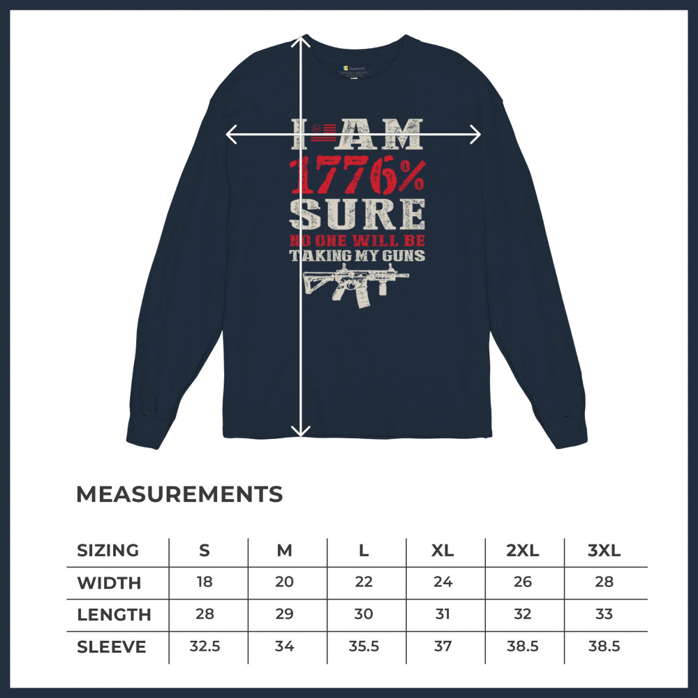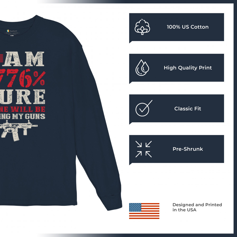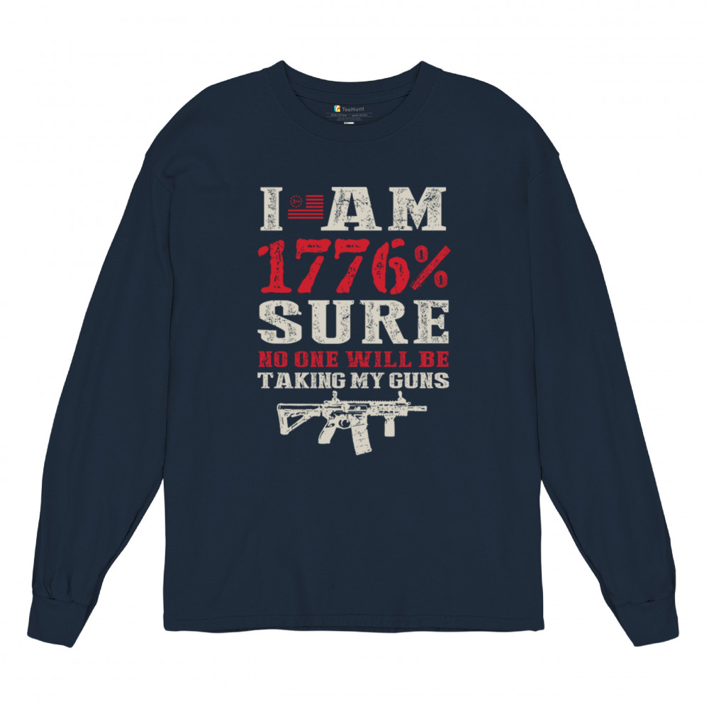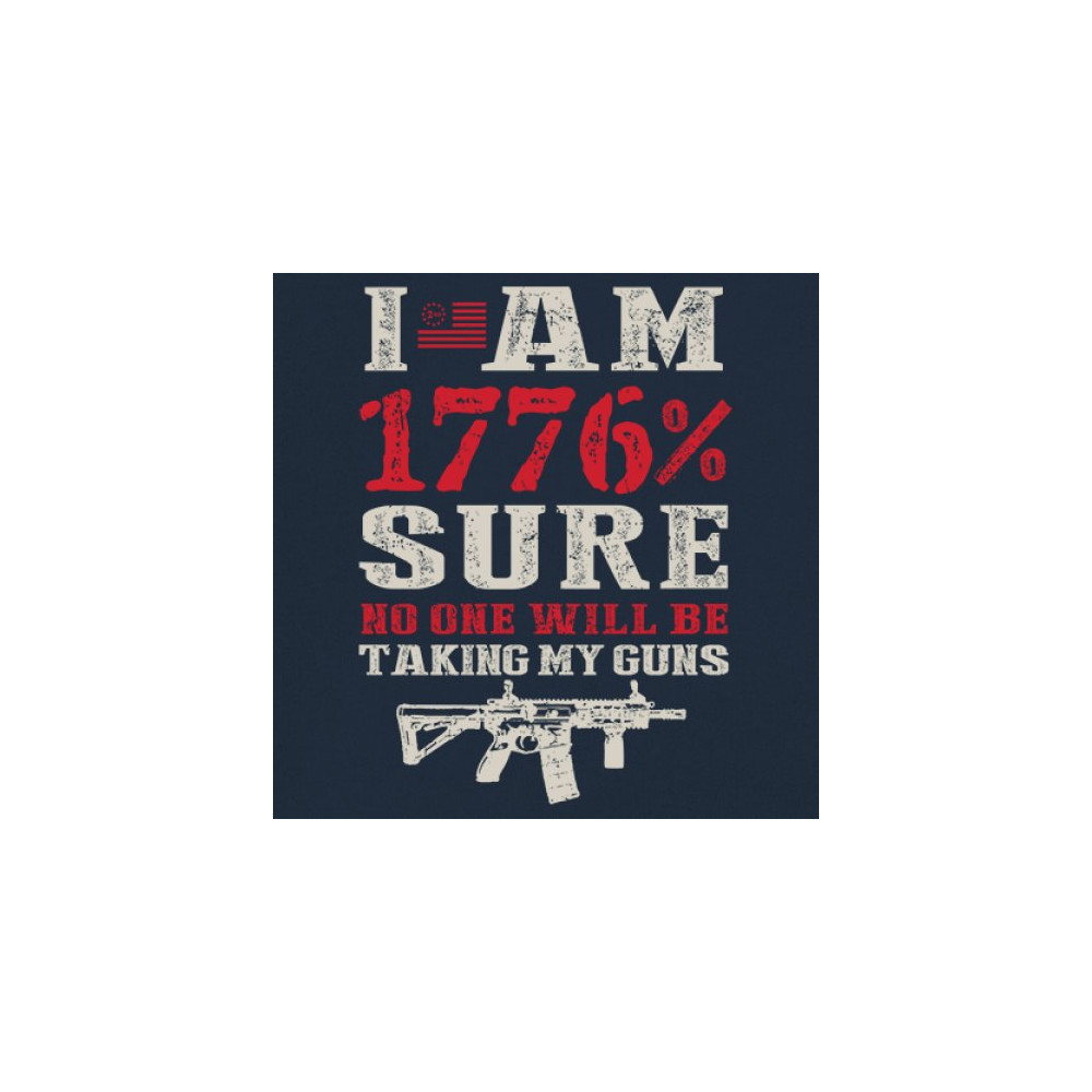 This eye-catching design shouts American pride with its 1776% certainty and pro-gun message. A distressed rifle graphic pairs with bold lettering and patriotic red, white, and blue styling. Perfect for gun owners, liberty advocates, and veterans who take their constitutional rights seriously. A true celebration of freedom and firepower.