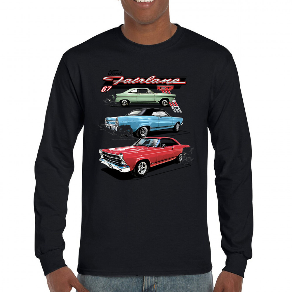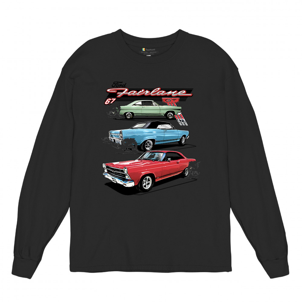 Features three 1967 Ford Fairlane GTs with retro burnout style. Great for muscle car fans, Ford collectors, car shows, and vintage meetups.
