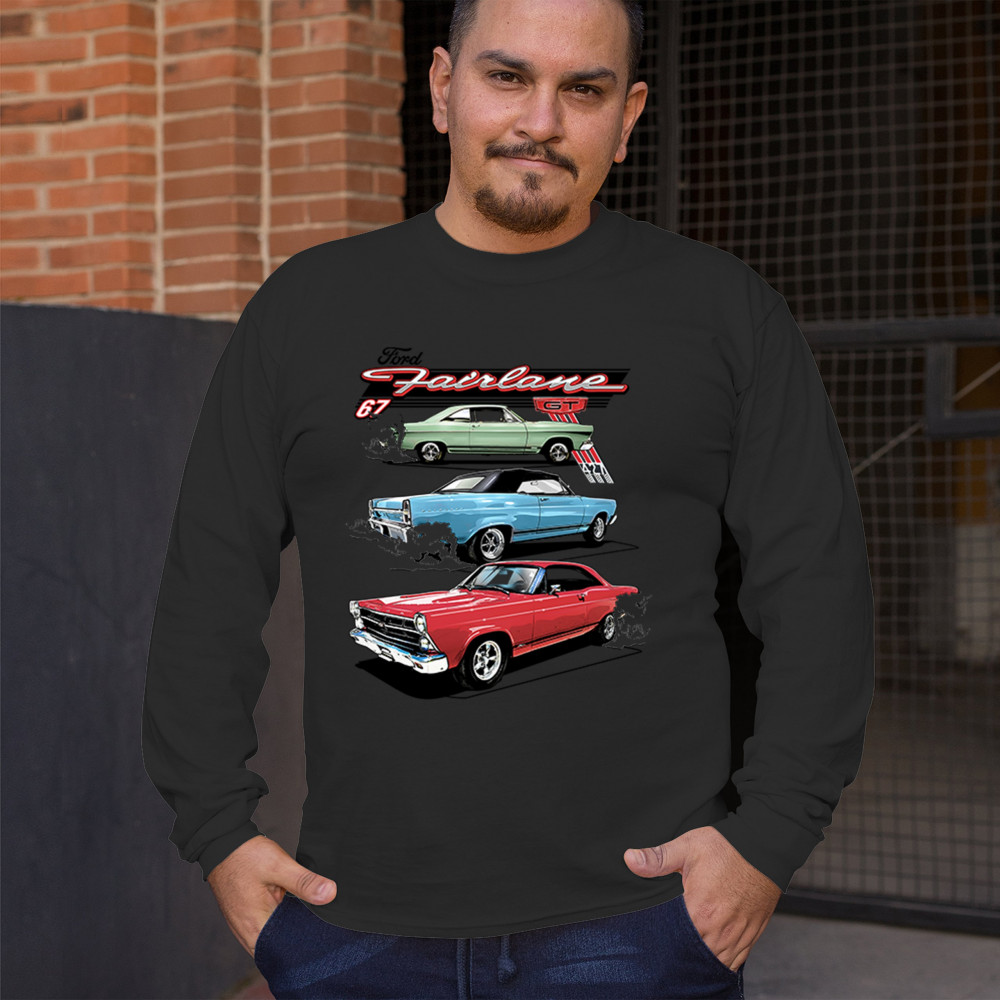 Celebrate the raw power of the 1967 Ford Fairlane GT with this burnout-charged design. Featuring three muscle cars in retro detail, it's made for vintage Ford collectors, classic car fans, and V8 enthusiasts. Whether you're heading to a show or wrenching in the garage, this design brings the roar of the 60s.